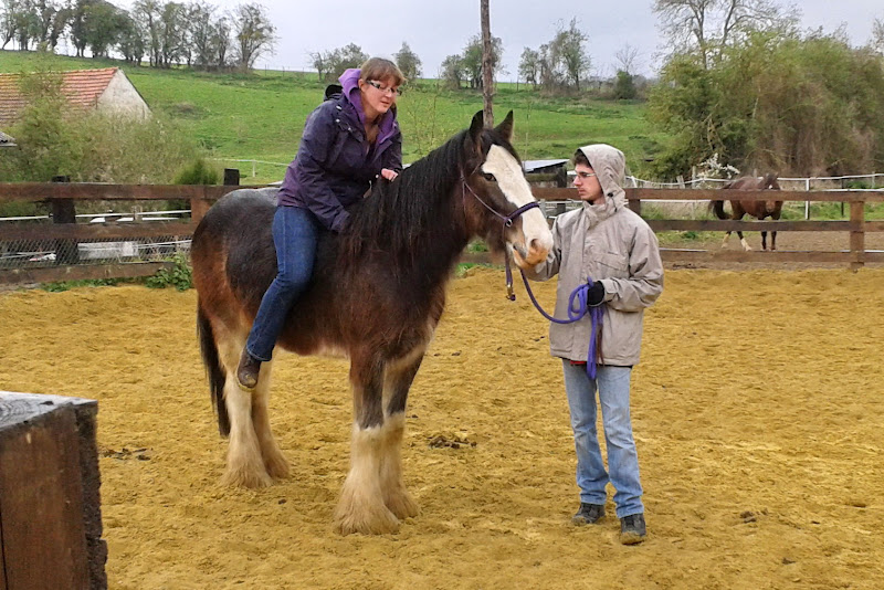chica327 0 Posté(e) le 28 mars 2012 Dimanche 18/03/2012 - Grande balade : 8 kmMon ancienne équipe fait un TREC à Marines. Comme ce n'est pas très loin, j'ai décidé de passer les voir, et de leur présenter Aldaan.On a donc mis Aldaan dans un van, où il est monté sans aucun problème, et direction Marines.Arrivée, on est resté quelques temps avec les copines à papoter.Au moment où elles devaient passer pour le PTV, il s'est mis à tomber des cordes...On s'est donc abrité dans le manège où les chevaux et cavaliers faisaient leur détente juste avant leur passage pour le PTV.On s'est mis dans un coin, et Aldaan a attendu bien sagement, même pas ému par les gens et les chevaux qui rentraient de plus en plus nombreux ! Pourtant, il y avait un vrai bazar là-dedans... Et bien Aldaan, lui, il s'est mis en mode y'a rien à faire, alors dodo.Au bout de presque 1h, il fallait prendre une décision. On a profité que la pluie se calmait un peu pour partir, heureusement, bien équipé contre la pluie.Au bout d'une dizaine de minute, plus de pluie !On a donc fait 8 km à pied pour rentrer.Une super balade, avec un Aldaan globalement sage.Quelques exercices en chemin, dont une jolie descente bien glissante, qu'on a refait 3 fois jusqu'à réussir à le faire très doucement, sans bousculade.Bien courbaturé à l'arrivée, mais une jolie balade presque sans pluie ! Partager ce message Lien à poster Partager sur d’autres sites
