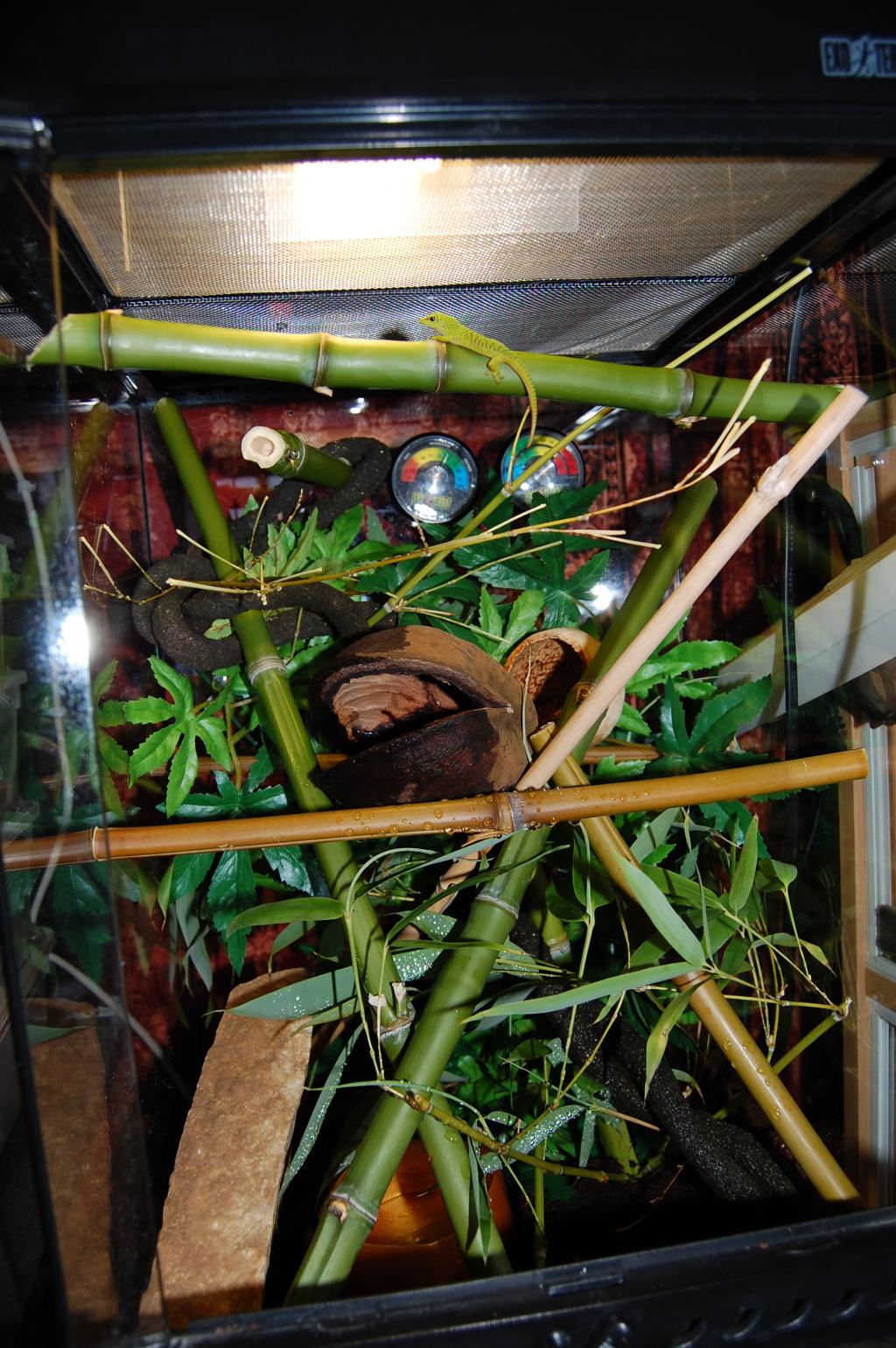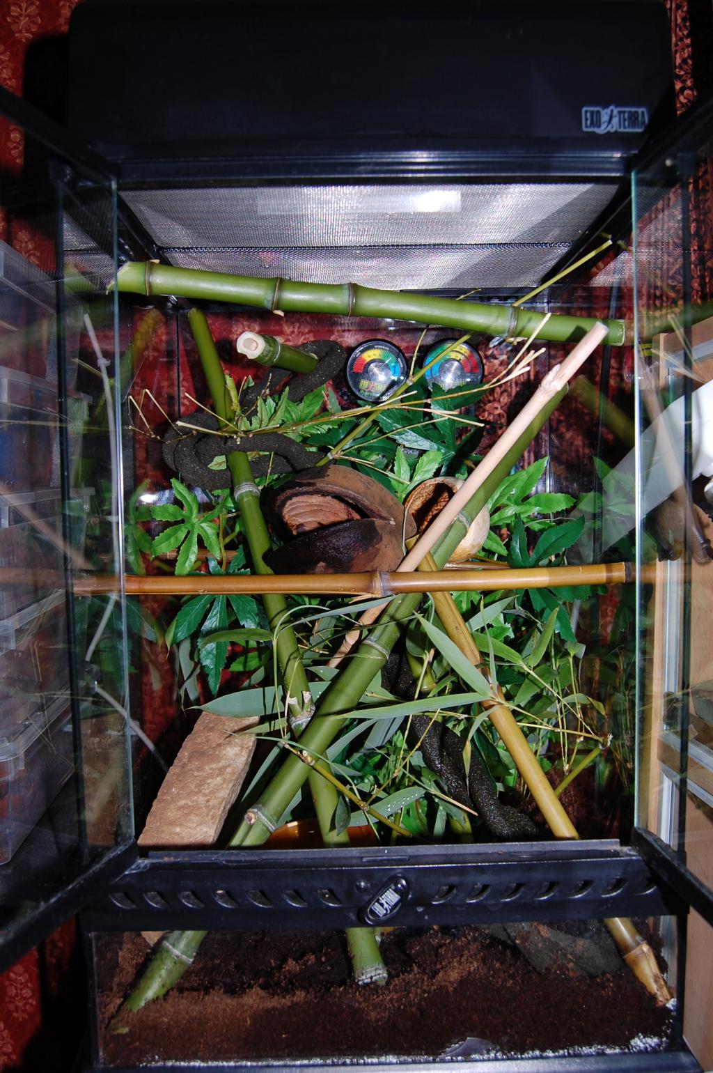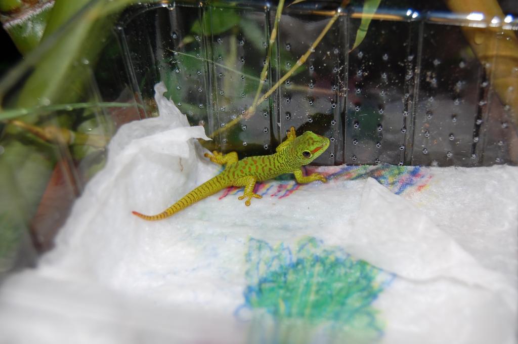 Spyderco 0 Posté(e) le 15 août 2009 coucou j'ai posté ceuci sur le monde du reptile le 13 aout au soir , le forum est grand vaste mais il faut bien le dire peut spécialisé donc je me retourne vers phelsufrance ... plus petit mais j'aurai plus de conseils spécialisés du moins je l'espère : Citation :Bonjour en cette fin d'après-midi j'ai accueilli chez moi mon premier Phelsu ! quelle pied ! les couleurs de ce tout petit juv sont splendide Je le maintien pour le moment dans un exo de 30 x 30 x 45, Uvb 5.0 26 W , point chaud 28 , point froid 25 pour le moment je ne dispose que de Red runner ( tartara) fraichement éclos pour le nourrir cela suffira ou les droso sont elle plus recommandé ? ou mico grigri ? ( je stress un peut car il faut avoué qu'il est vraiment tout petit ) que pensé vous de l'aménagement du terra ? des idée ou des conseils ? des petites photo pour le plaisir des yeux : a sont arrivé dans ça petite boite a grigri humidifié il ne tien pas encore super bien sur les tige de bambou mais saute très bien de la vite a la branche 2 vaporisations par jour et un goute goute maintienne un bon taux d'humidité ( j'avais fait les tests plusieurs jour avant :-D ) Cabriole sur la vitre Il ventousait de mieux en mieux ma la lumière c'est éteinte et il est parti faire dodo :love2: dans le coin a gauche sur le bambou Je recherche aussi un gros tube de bambou pour foré des trous et crée des cachettes en hauteur et bien grande ( ça va pas être simple ça :? ) je me tâte pour une plante ... j'ai pas encore tenté l'expérience des vrais plantes en terra ... j'ai un tite liste trouvé sur phelsuma France ... je verrait bien , les Areca, Kentia ,Cyperus papyrus m'intéresse car très esthétique ( peut être dur a trouver en petite tailles ) mais si je me sent pas sur de moi je ne le ferait pas car je ne veut prendre aucun risque on ma bien expliqué la fragilité des bébé phelsu donc je prend gardedepuis le terra a reçu un tout petit Areca, une gamelle en hauteur avec de la compote pour bébé pomme banane , quelque goute de miel mélangé a du calcium D3 sur le museau j'ai acheter des droso et des mini grillons mais il semble bien plus attiré par les toutes petite red runner de 1 ou 2 millimètres qui cavalent partout je recherche actuellement du bambou pour fait une branche horizontale avec des trous pour qu'il ce cache les phelsumistes ils en disent quoi ? le terra est bien ? j'ai fait une gaffe que je peut rattraper ? Partager ce message Lien à poster Partager sur d’autres sites