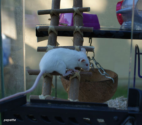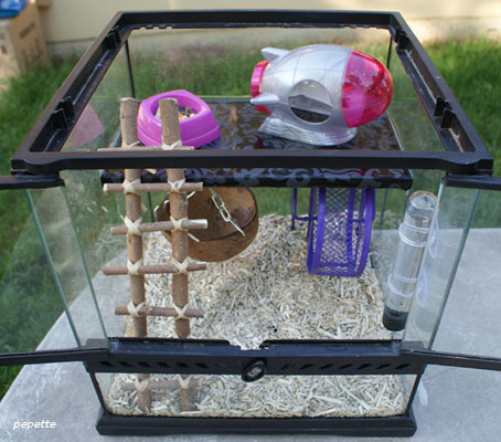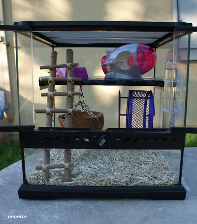 pepette02 0 Posté(e) le 4 juin 2010 Voila, comme prévu Cocaïne a intégrer son terra,j'ai réussi a y ajourer un étage mais pas sur la totalité, il faut juste un peu plus de la moitier mais je n'ai pas eu trop le choix vu que j'avais oublié la roue mais surtout le biberon ! et le sien est tout en hauteur.Je lui ai aussi fait une balancoire dans une demi coco, et une échelle en noisetier (fixé uniquement avec du rafia naturel, j'espère qu'il passera la nuit )Qu'est ce que je peux rajouter pour qu'elle s'amuse ?je pensais à des cordages pour perroquet, mais je ne sais pas si c'est bien ...Bon, pour le moment elle visite, y'a pas le feu non plus . Partager ce message Lien à poster Partager sur d’autres sites