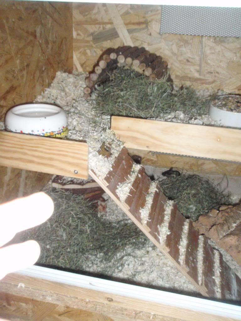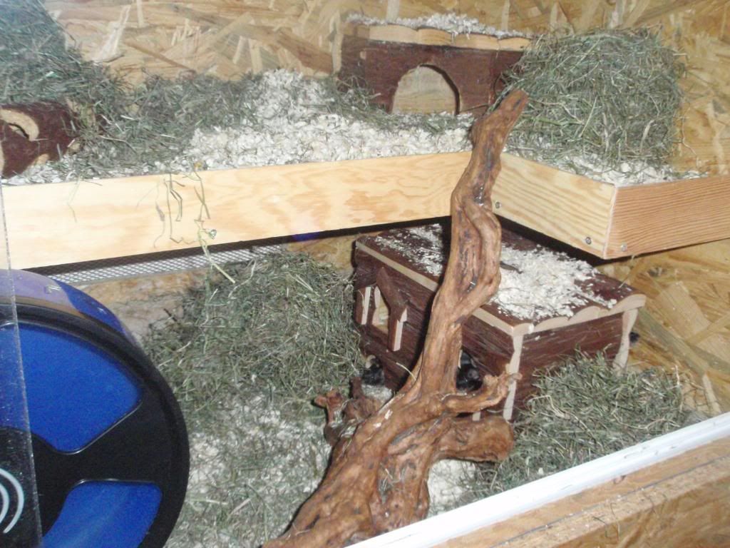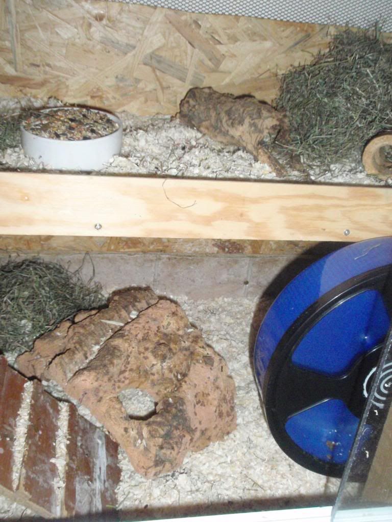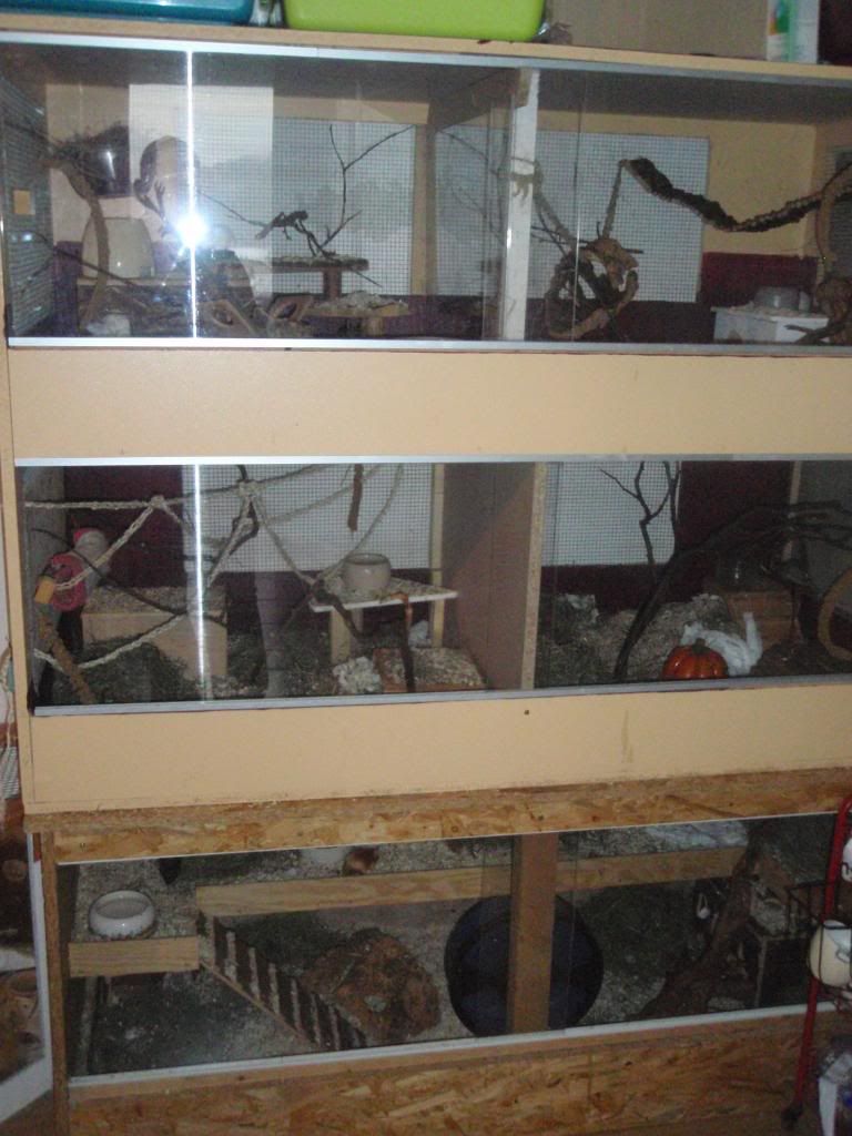 Minimausi85 0 Posté(e) le 15 janvier 2011 here are my mousery. my mices lives together, a big groope of ladys in the big cage. it's 150cm lang, 60cm deep and 70cm high, and the "Etage/Ebene???" is 150 x 35cm .here the tower. it was self made above and in the middle of the tower is fully connected.all 4 chambers can be joined together '. individually they are 70x60xm had 50cm high.Here the females get their puppies.I live there or in a 60x40x40cm dunasome empressions.and the big duna 70x40cm and one "etage/eben"? Partager ce message Lien à poster Partager sur d’autres sites