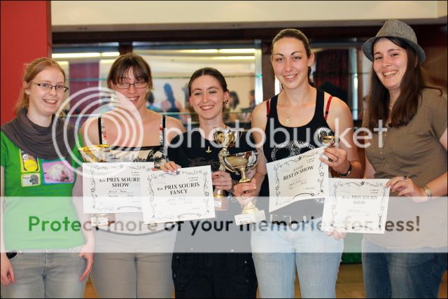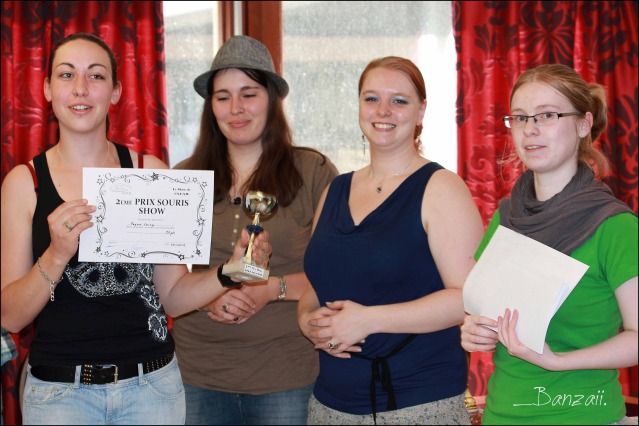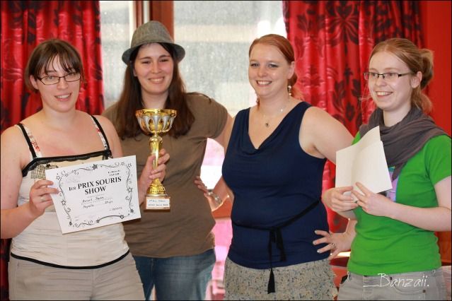 Dawww1 0 Posté(e) le 6 juin 2012 Le Show de L'A.F.A.R.1ére édition : 27/05/12 (show souris) :Best In Show :SGB Olga - Pew - 99 points - YucunaCatégorie Fancy :1 - Tundra - Agouti Broken Marked satin - 96.5 points - Yudrae2 - Sérénity - Noir tan étoilée - 92.5 points - Yudrae3 - Noctiss - Noir Unie - 92.5 points - YudraeCatégorie Show :1 - HVR Physalis - Siamoise - 99 points - Oxalys2 - SGB ? - Bone - 98 points - Yucuna3 - HVR Onomée - 96 points - CPB Satin - Aquila4 - SDV Dawn - 94.5 points - Tricolore red - Banzaii5 - SDV Kumaki - 93.5 points - Bone - AquilaEn gras les gagnant des 4 prix : Best In show, Premier Prix Fancy, Premier Prix Show, Second Prix Show.Juge : Dawww (Ophélie), Juge suppléant : Psysik (Loïse)Secrétaire : Psysik (Loiïse), Secrétaire suppléante : AquilaLe jugement :Les gagnants entouré par la juge et la secrétaire : Partager ce message Lien à poster Partager sur d’autres sites