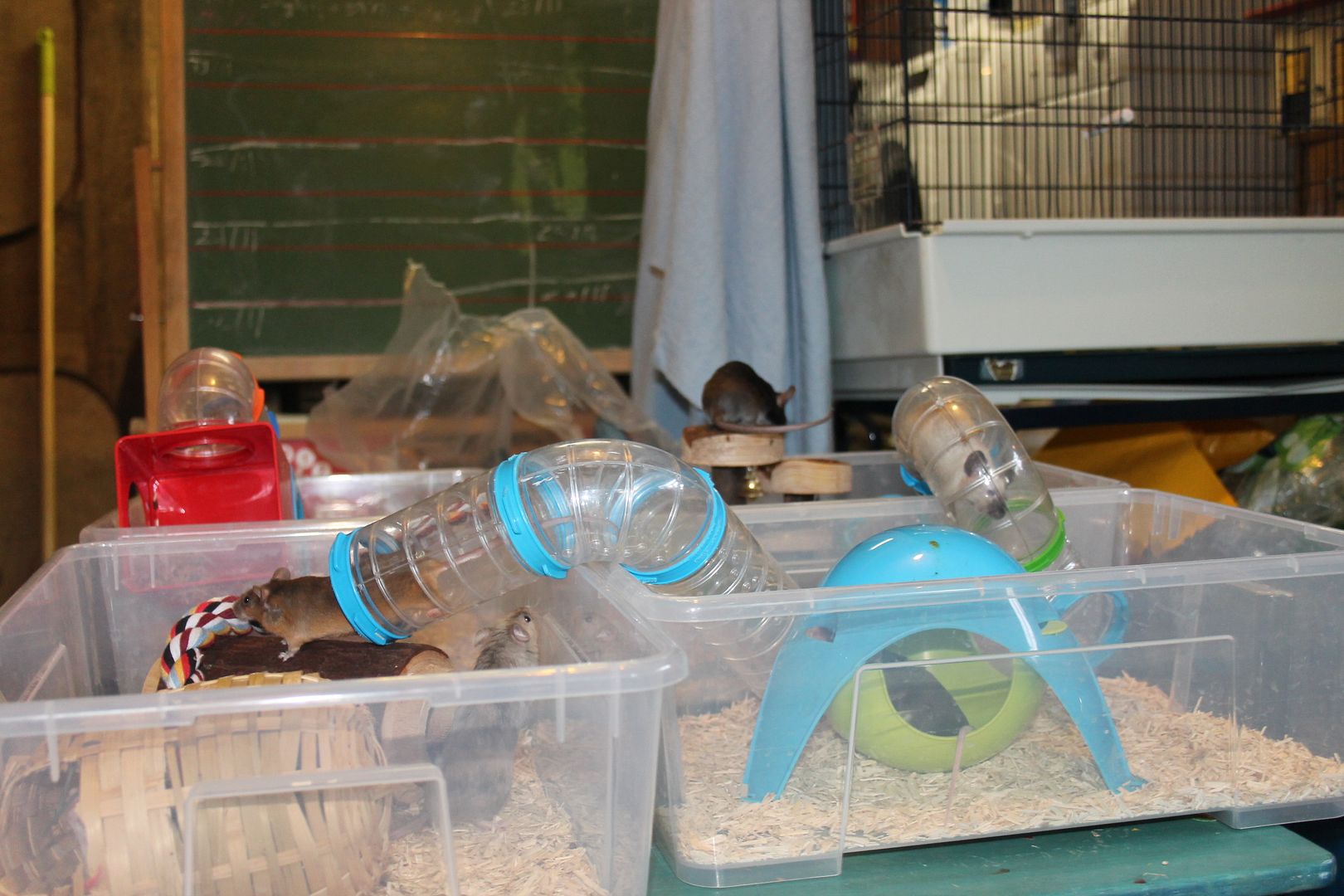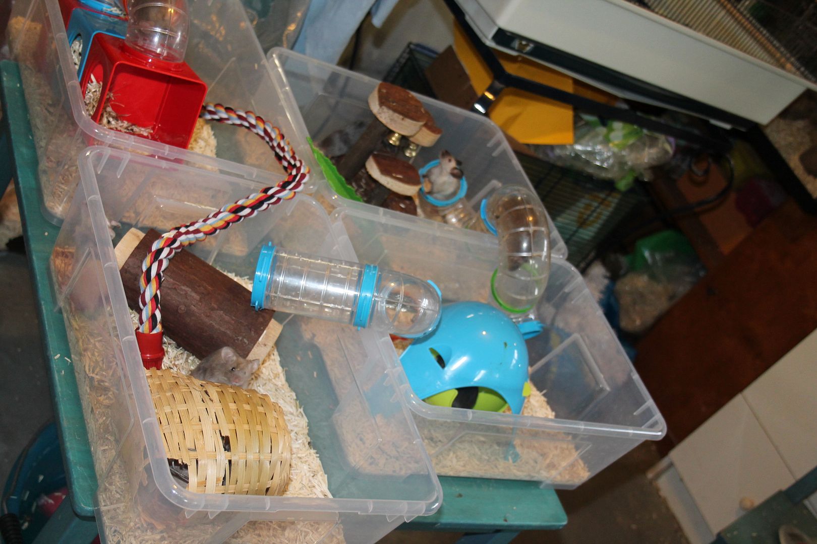 bluely 0 Posté(e) le 23 janvier 2013 Ayant récupéré une volière à mon manège,j'ai décidé de l'utilise pour les souris en y effectuant quelques aménagements.J'y ai donc ajouté 6 bacs plastique,de plus ou moins 35 cm x 20 cm x 8 cm, en guise d'étages.J'y ai mis à l'intérieur de la litière.Elle fait approximativement 80 x 50cm au sol + les 6 bacs ( 700x6).Ce qui fait un total de 8200 cm2 environ.C'est un groupe de 13 souris qui y vit : 11 fifilles et 2 mâles castrés ( SDV Aude,SDV Blue Sky,SIL Sunlight,HVR Belladone,HVR Gini,OP Hécate,"Bellemouse" Skyfall et Chiara,Tara,"Ayronna's" Fiona,HVR Shenzi,SDV Undercover et SIL archimède). Place aux photos!!!Je sais pas pourquoi,mais l'essentiel des petits résidants de la volière a la manie de dormir au dernier étage même si l'énorme nid est en bas...Du coup,je leur ai monté des mouchoirs en haut mais ils ne sont pas sur la photos...En tout cas,ils ont l'air d'apprécier leur nouvelle résidance les loulous : ils courent sur les ponts,escaladent,sautent dans les roues,...Ils sont pleins d'énergie!Je sui heureuse de les voir ainsi!!! Partager ce message Lien à poster Partager sur d’autres sites