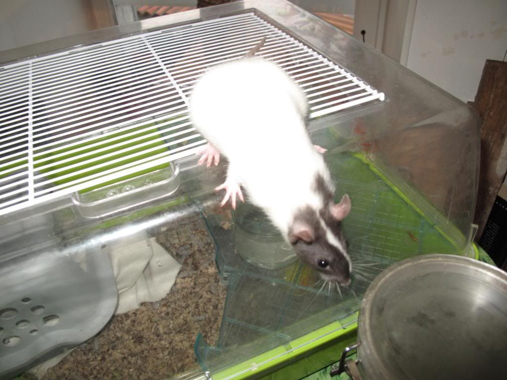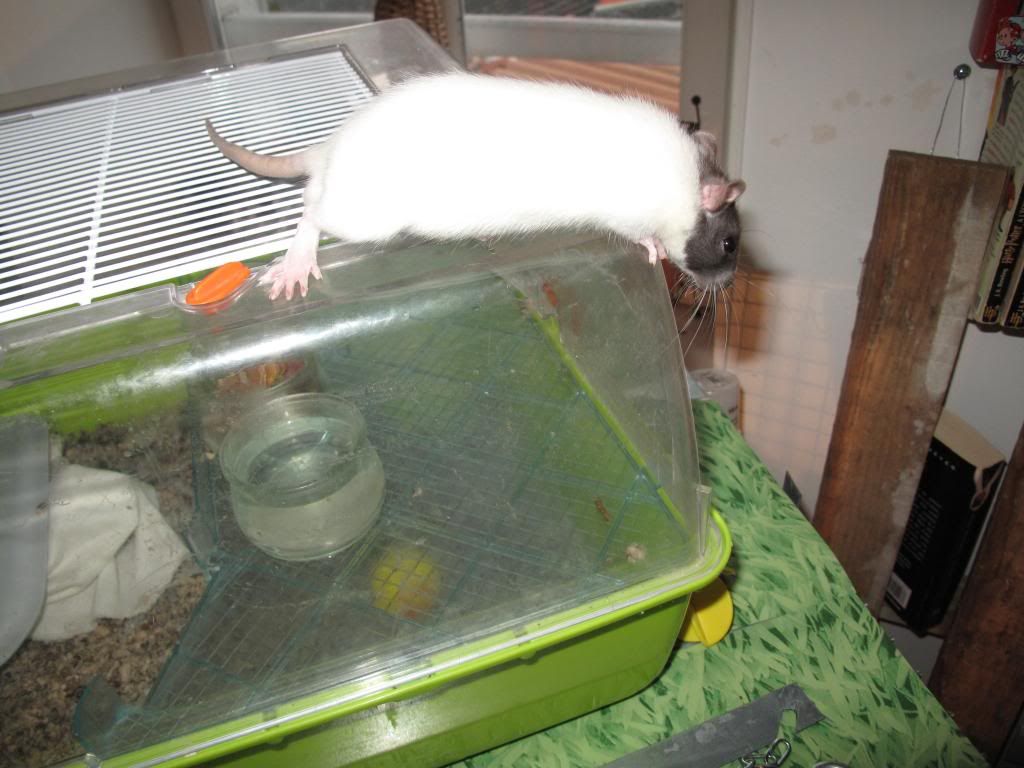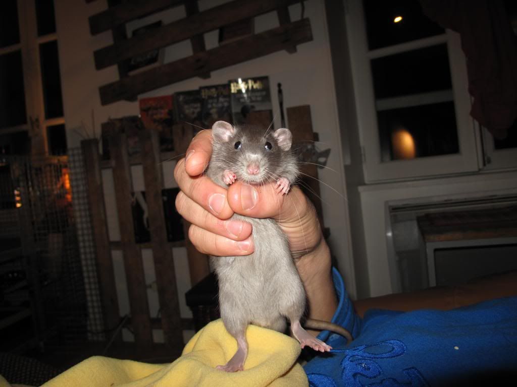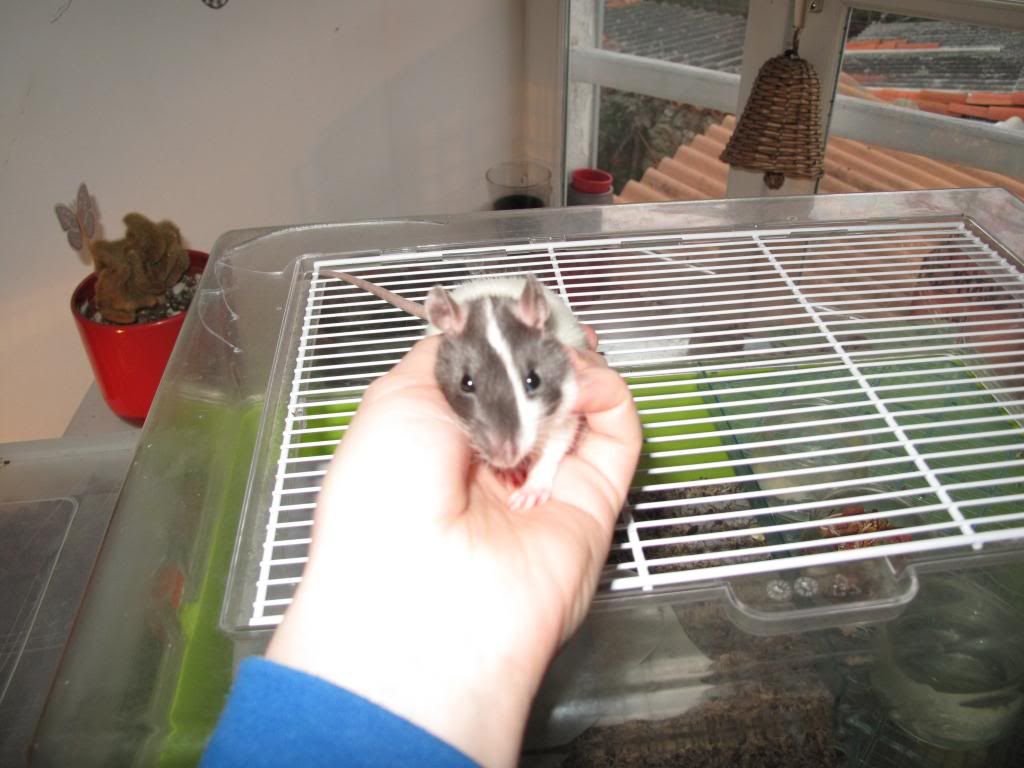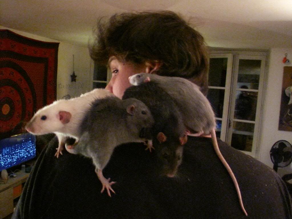 Orfée11 0 Posté(e) le 14 octobre 2013 je continue dans la mise a jour de mes posts.... en avril dernier a Houten, j'avais adopté Morzan et Murtagh, deux petits ratoux qui font toujours mon bonheur, ils ont actuellement 7 mois. mon chéri s'est lui aussi passionné pour les rats lorsqu'il les a rencontrés, et a souhaité que l'on agrandisse la famille. Lui voulais un rat bleu dumbo (oui il est difficile en plus), et moi je voulais adopter deux nouveaux rats, pour faciliter l'intégration avec les deux déjà présents. j'ai trouvé mon bonheur à l'ECC XL de Barneveld (et ce ne fut pas facile du tout!), nous ont donc rejoins Merlin (lila berkshire blazed) et Mathieu (bleu russe) deux jeunes rats dumbo de 3 mois. mon homme leur a construit une immense cage d'1M/1M/1M, que nous aménageons progressivement (je me mets a construire moi même des hamacs par souci d'économie donc ça prend du temps). a savoir que nos rats sont en liberté dans l'appart dès que nous sommes présents, ils ont donc en moyenne 25m2 pour jouer tout les 4, et sont très proches de nous (surtout lorsque je fais la cuisine et qu'ils attendent tous à mes pieds que quelque chose tombe )depuis la dernière escapade de Merlin dans le moteur du frigo nous avons augmenté la sécurité de l'appart et bloqué tous les passages possibles et imaginables, ce petit fripon est très aventureux. voici donc les photos de leur palace : un ptit coucou de Murtagh : et les photos des ratoux : le groupe sur les épaules de chéri: (chéri fait 2 mètres et a donc les épaules larges, sur le miennes ça tient a peine )Morzan et Mathieu : Mathieu : Merlin qui ne tient pas en place et est donc très difficile a photographier :Morzan : Murtagh : Partager ce message Lien à poster Partager sur d’autres sites