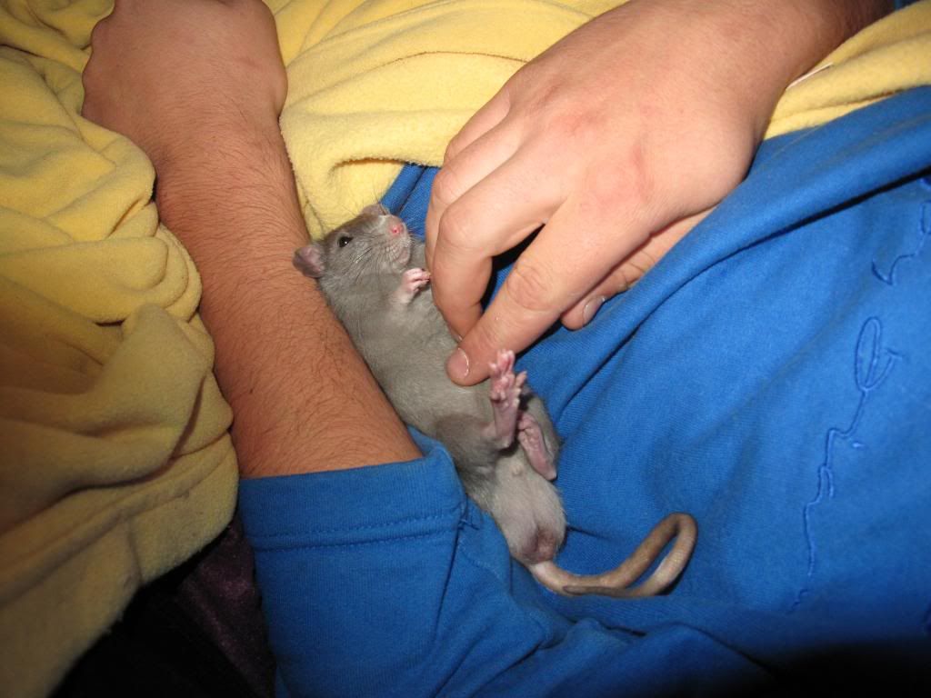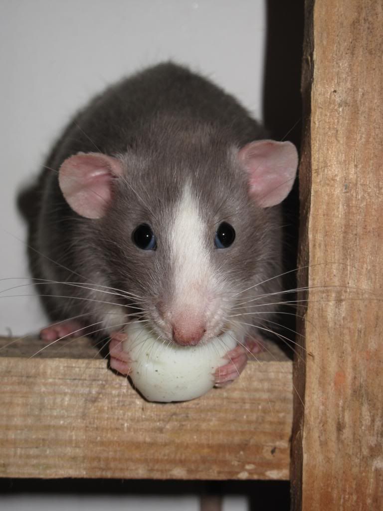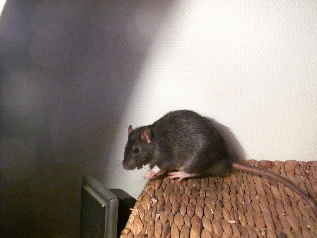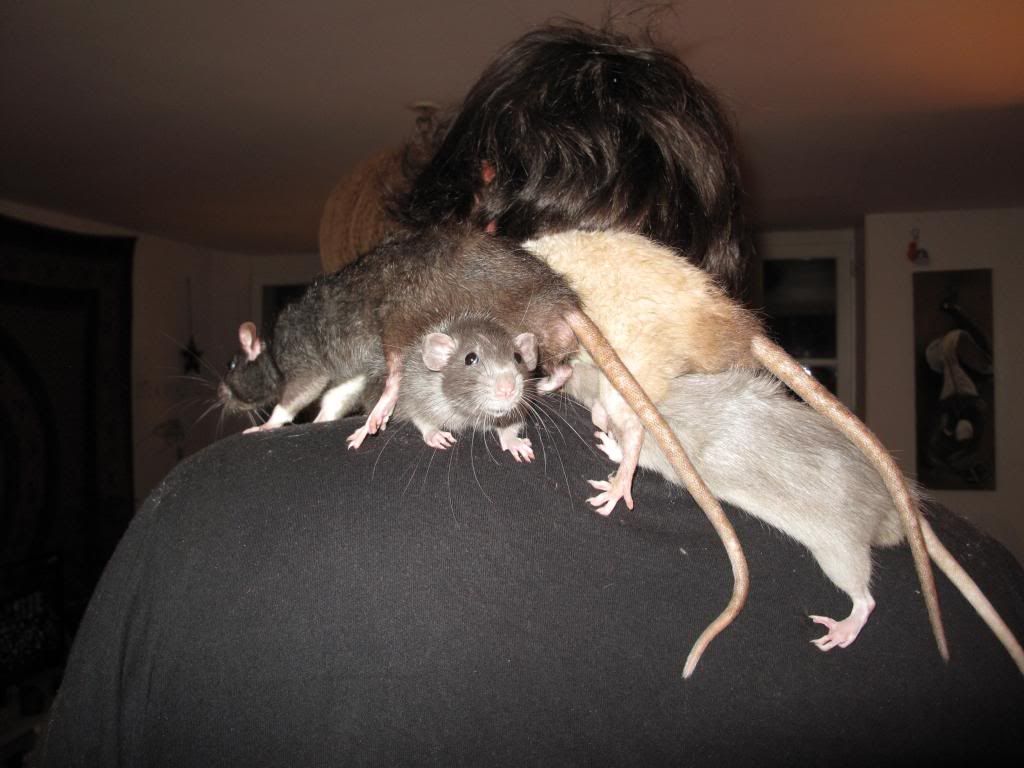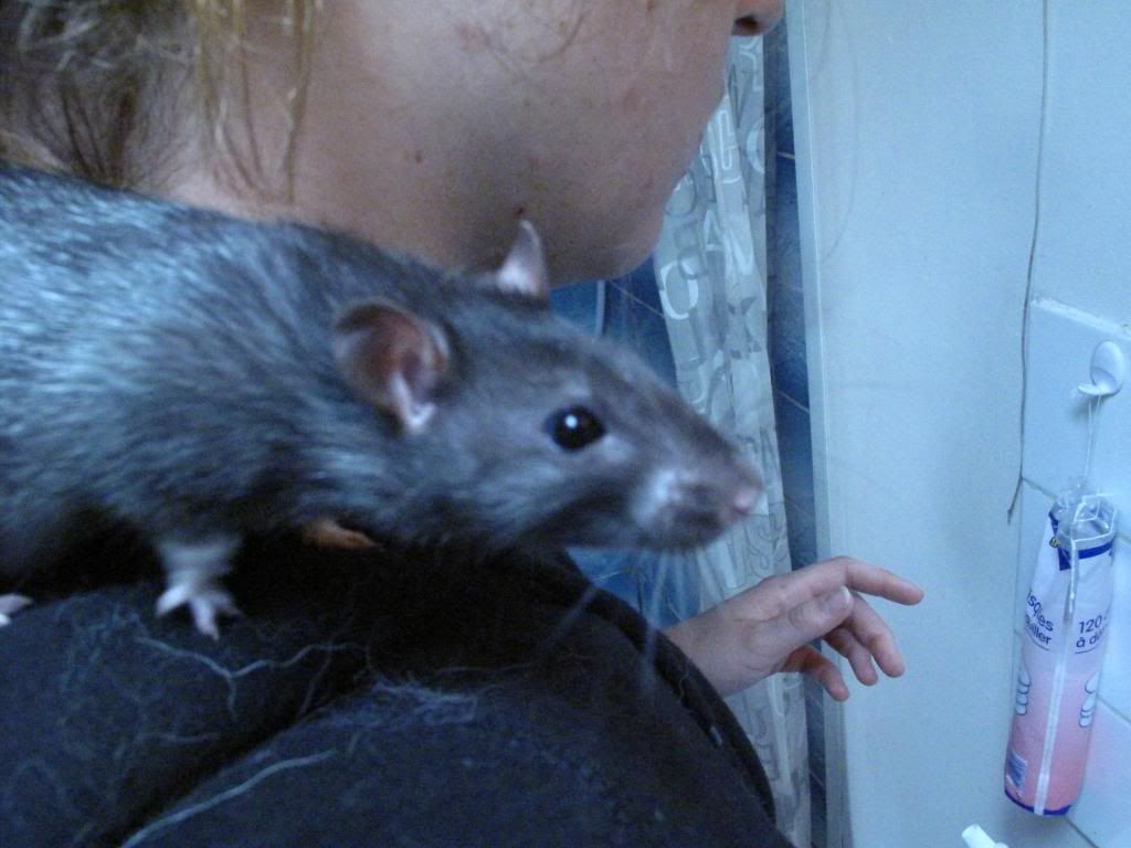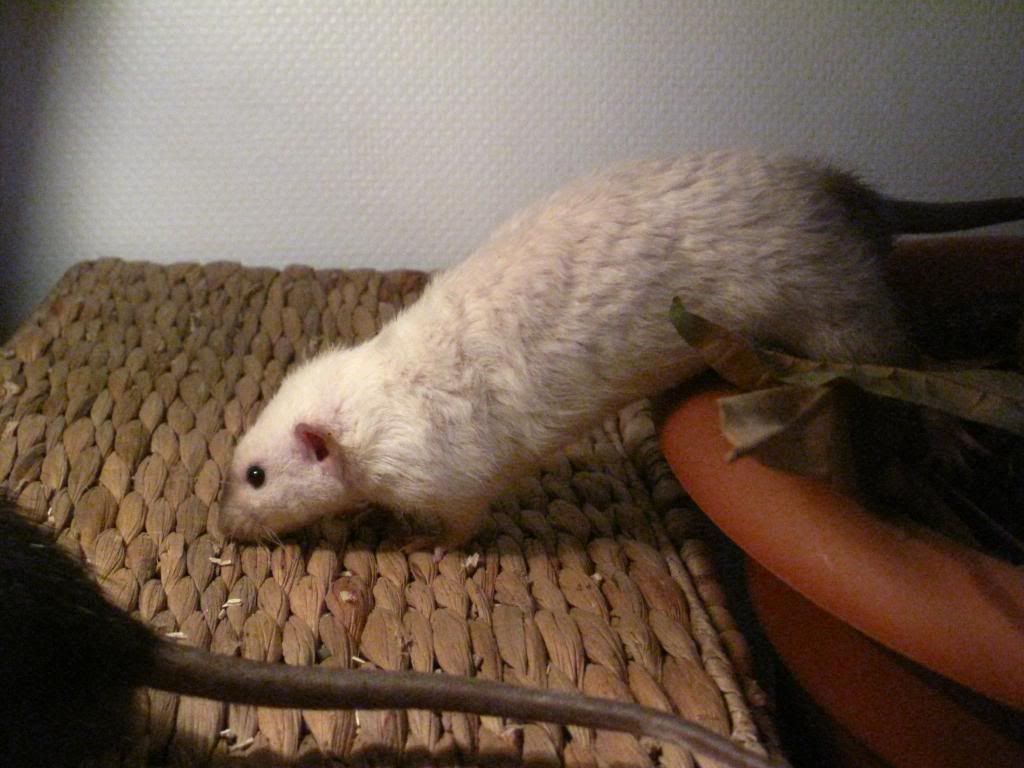 Orfée11 0 Posté(e) le 14 octobre 2013 je continue dans la mise a jour de mes posts.... en avril dernier a Houten, j'avais adopté Morzan et Murtagh, deux petits ratoux qui font toujours mon bonheur, ils ont actuellement 7 mois. mon chéri s'est lui aussi passionné pour les rats lorsqu'il les a rencontrés, et a souhaité que l'on agrandisse la famille. Lui voulais un rat bleu dumbo (oui il est difficile en plus), et moi je voulais adopter deux nouveaux rats, pour faciliter l'intégration avec les deux déjà présents. j'ai trouvé mon bonheur à l'ECC XL de Barneveld (et ce ne fut pas facile du tout!), nous ont donc rejoins Merlin (lila berkshire blazed) et Mathieu (bleu russe) deux jeunes rats dumbo de 3 mois. mon homme leur a construit une immense cage d'1M/1M/1M, que nous aménageons progressivement (je me mets a construire moi même des hamacs par souci d'économie donc ça prend du temps). a savoir que nos rats sont en liberté dans l'appart dès que nous sommes présents, ils ont donc en moyenne 25m2 pour jouer tout les 4, et sont très proches de nous (surtout lorsque je fais la cuisine et qu'ils attendent tous à mes pieds que quelque chose tombe )depuis la dernière escapade de Merlin dans le moteur du frigo nous avons augmenté la sécurité de l'appart et bloqué tous les passages possibles et imaginables, ce petit fripon est très aventureux. voici donc les photos de leur palace : un ptit coucou de Murtagh : et les photos des ratoux : le groupe sur les épaules de chéri: (chéri fait 2 mètres et a donc les épaules larges, sur le miennes ça tient a peine )Morzan et Mathieu : Mathieu : Merlin qui ne tient pas en place et est donc très difficile a photographier :Morzan : Murtagh : Partager ce message Lien à poster Partager sur d’autres sites
