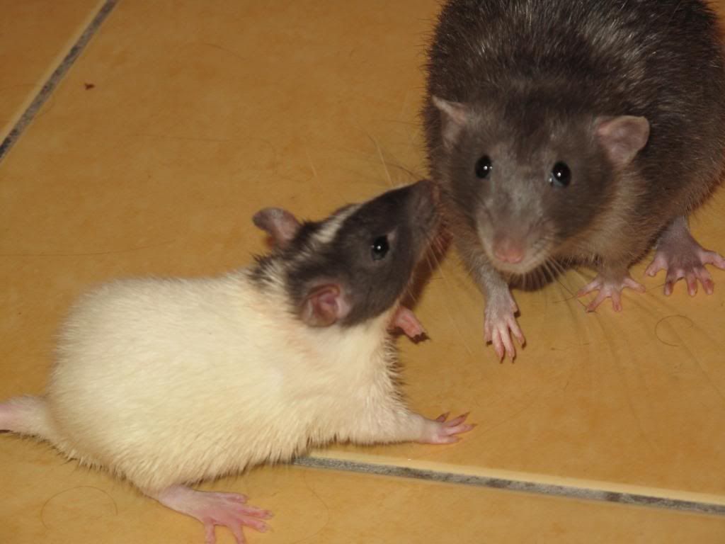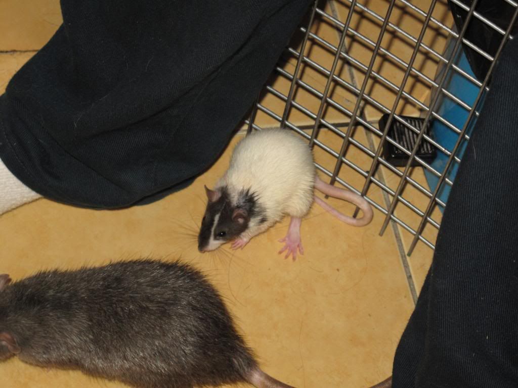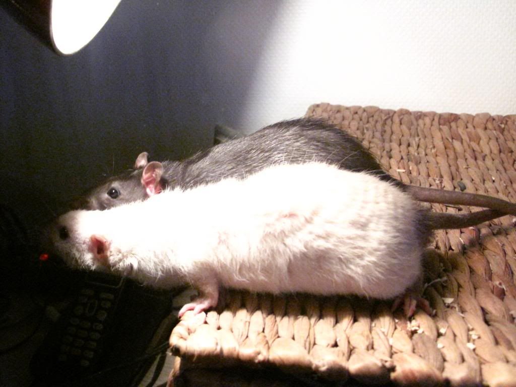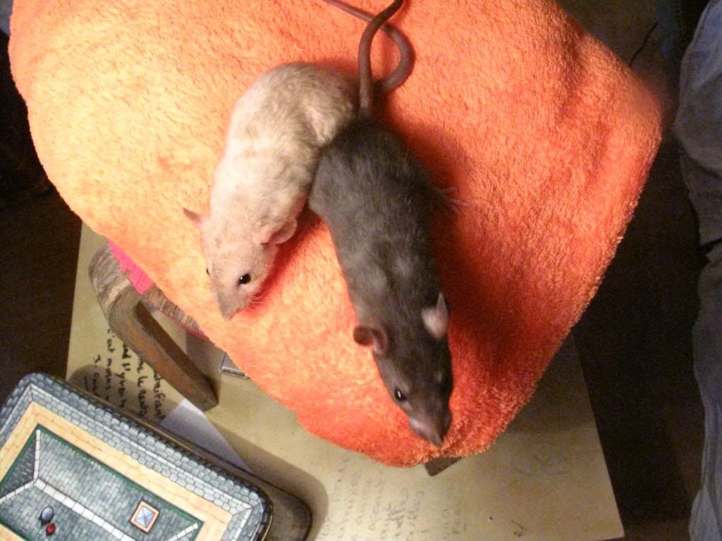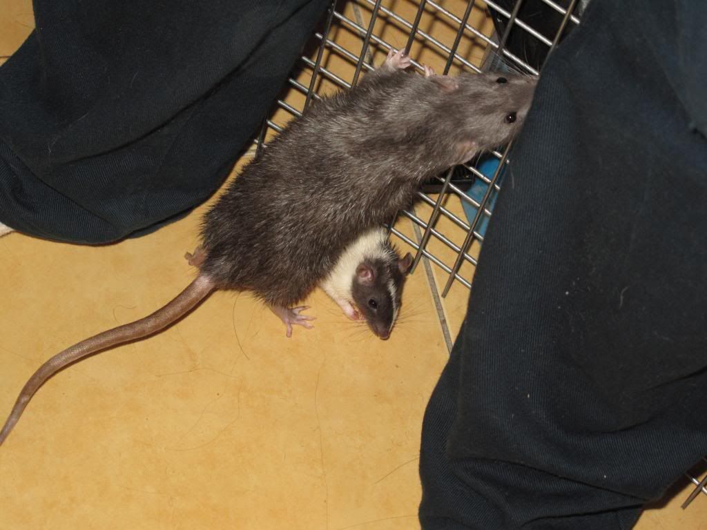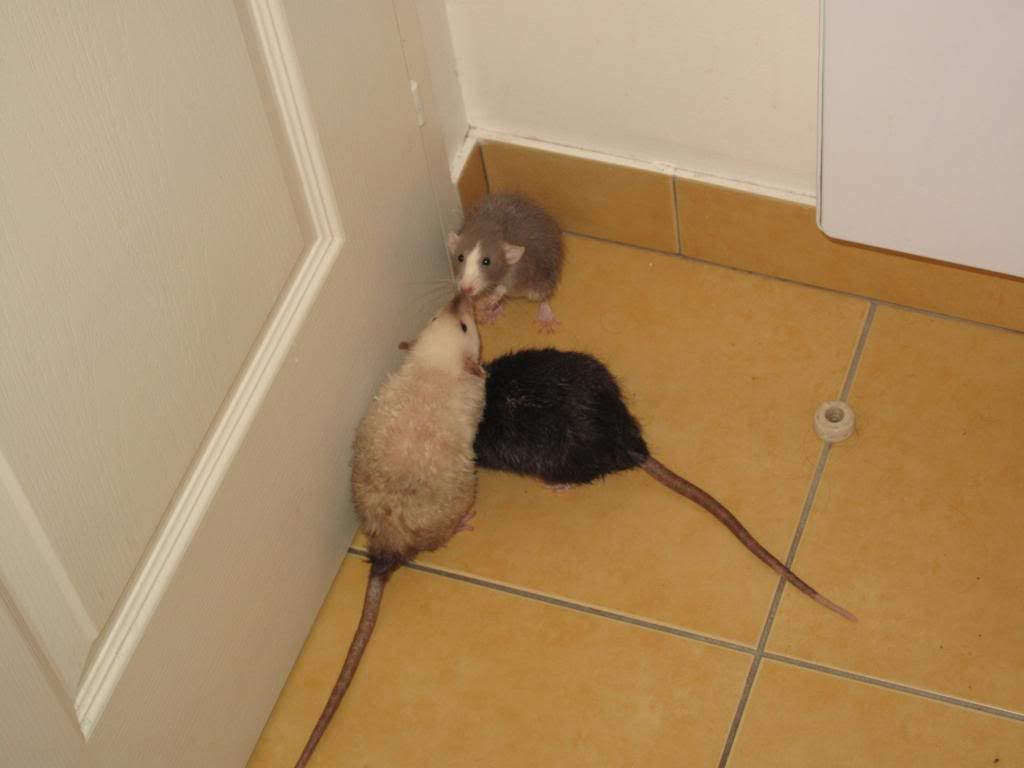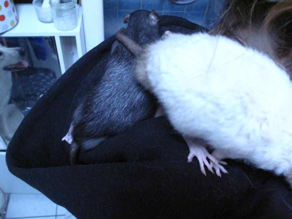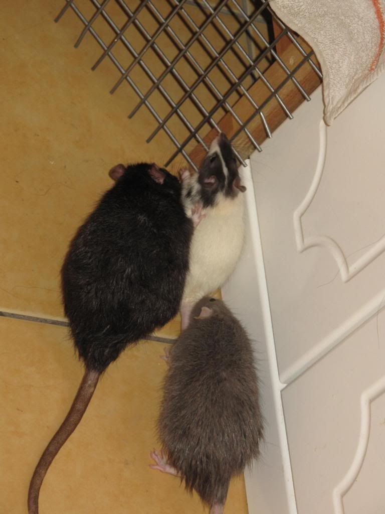 Orfée11 0 Posté(e) le 9 avril 2013 Certains le savent peut etre déjà mais avant d'entrer dans le monde des souris j'étais plutôt rats, j'ai eu beaucoup de ratous chez moi, mâles et femelles pendant plusieurs années. la perte de mon dernier rat m'avait tellement anéantie que je ne voulais plus en reprendre.....mais voilà après 5 ans sans rat, j'ai craqué à nouveau à l'occasion d'Houten. et je ne regrette pas !! j'avais oublié ce que c’était les rats, mais comment ai je pu m'en passer si longtemps ?? j'ai donc adopté deux petits mâlous, je n'ai pas encore de photos individuelles, ces messieurs sont un peu trop speed pour poser plus de 5 secondes, je poste donc les photos de leur première rencontre avec Famas. Au début chacun s'est reniflé a travers les barreaux, puis rencontre sur le canapé, les ratoux avaient un peu peur au départ mais il ont vite compris que Famas serait un copain pour eux et ils s'amusent a lui mettre des coups de pattes puis a s'enfuir sous le pull de maman, et ainsi de suite depuis 10mn....le chien leur mets de gros coup de langue pour se venger. c'est quoi cette nouvelle cage ? elle est où la bestiole ? elle est sur l'étage !! sacrée grosse souris c'est bizarre ...oh elle vient me dire bonjour....chacun semblant curieux de rencontrer l'autre...allez hop sur le canapé : et enfin la photo bonus, les petits m'ont sauté sur les genoux pendant que je prenais les photos, et Famas a suivi le mouvement, vu d'en haut ça donne ça : le petit raton noir berkshire se prénomme Morzan, il vient de chez Nadine, il a 5 semaines, il me semble très intelligent, il est vif mais déjà très proche de moi, il est constamment à vouloir me grimper dessus. L'autre est siamois rex, il se prénomme Murtagh, il a environ 6 semaines, lui c'est plus une petite patate qui s’endort dans ma capuche ou mon écharpe pendant des heures, il est adorable et ses oreilles dumbo lui donne une bouille de peluche. bientôt des photo individuelles, quand ils seront plus calmes !! Partager ce message Lien à poster Partager sur d’autres sites