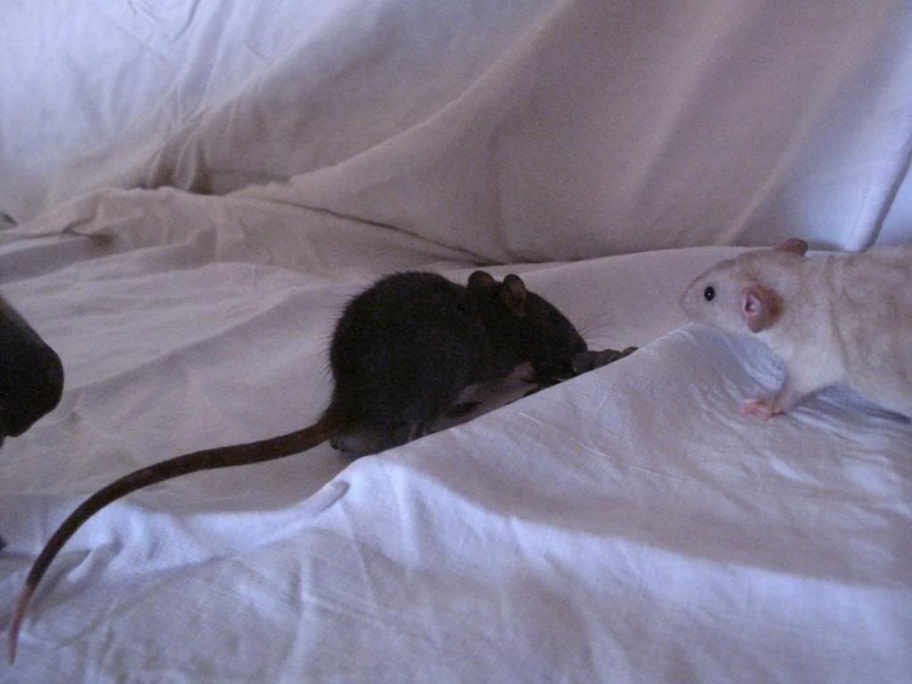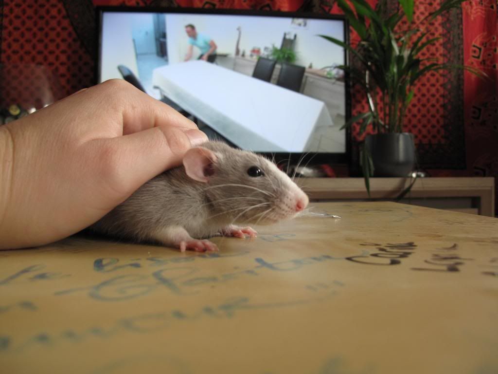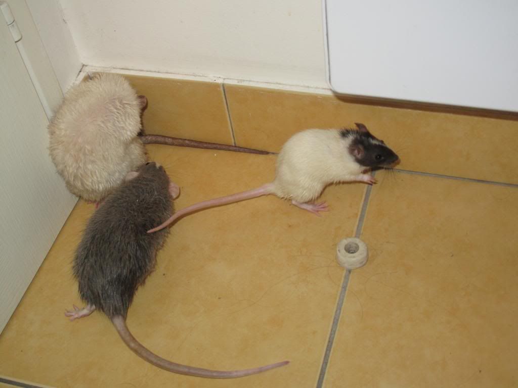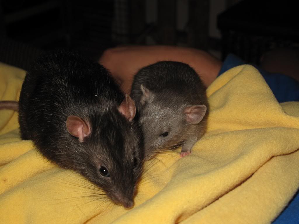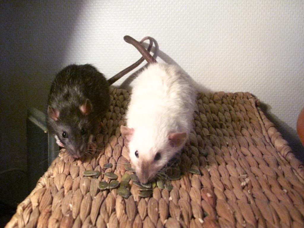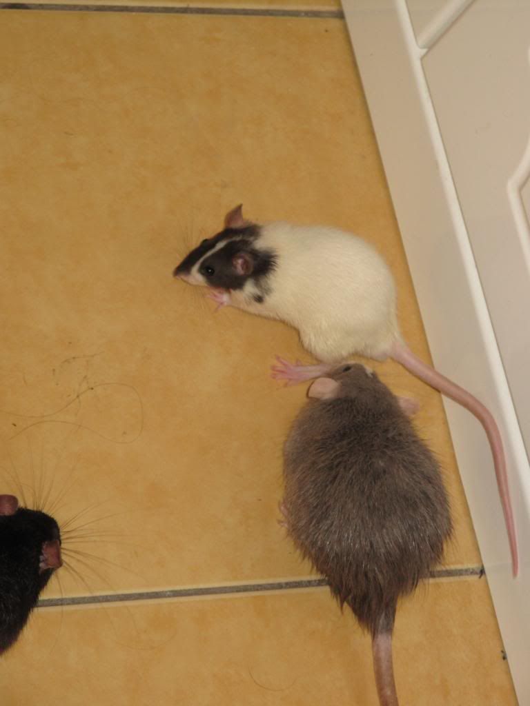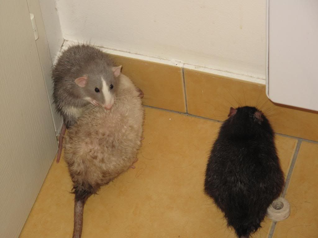 Orfée11 0 Posté(e) le 9 avril 2013 Certains le savent peut etre déjà mais avant d'entrer dans le monde des souris j'étais plutôt rats, j'ai eu beaucoup de ratous chez moi, mâles et femelles pendant plusieurs années. la perte de mon dernier rat m'avait tellement anéantie que je ne voulais plus en reprendre.....mais voilà après 5 ans sans rat, j'ai craqué à nouveau à l'occasion d'Houten. et je ne regrette pas !! j'avais oublié ce que c’était les rats, mais comment ai je pu m'en passer si longtemps ?? j'ai donc adopté deux petits mâlous, je n'ai pas encore de photos individuelles, ces messieurs sont un peu trop speed pour poser plus de 5 secondes, je poste donc les photos de leur première rencontre avec Famas. Au début chacun s'est reniflé a travers les barreaux, puis rencontre sur le canapé, les ratoux avaient un peu peur au départ mais il ont vite compris que Famas serait un copain pour eux et ils s'amusent a lui mettre des coups de pattes puis a s'enfuir sous le pull de maman, et ainsi de suite depuis 10mn....le chien leur mets de gros coup de langue pour se venger. c'est quoi cette nouvelle cage ? elle est où la bestiole ? elle est sur l'étage !! sacrée grosse souris c'est bizarre ...oh elle vient me dire bonjour....chacun semblant curieux de rencontrer l'autre...allez hop sur le canapé : et enfin la photo bonus, les petits m'ont sauté sur les genoux pendant que je prenais les photos, et Famas a suivi le mouvement, vu d'en haut ça donne ça : le petit raton noir berkshire se prénomme Morzan, il vient de chez Nadine, il a 5 semaines, il me semble très intelligent, il est vif mais déjà très proche de moi, il est constamment à vouloir me grimper dessus. L'autre est siamois rex, il se prénomme Murtagh, il a environ 6 semaines, lui c'est plus une petite patate qui s’endort dans ma capuche ou mon écharpe pendant des heures, il est adorable et ses oreilles dumbo lui donne une bouille de peluche. bientôt des photo individuelles, quand ils seront plus calmes !! Partager ce message Lien à poster Partager sur d’autres sites