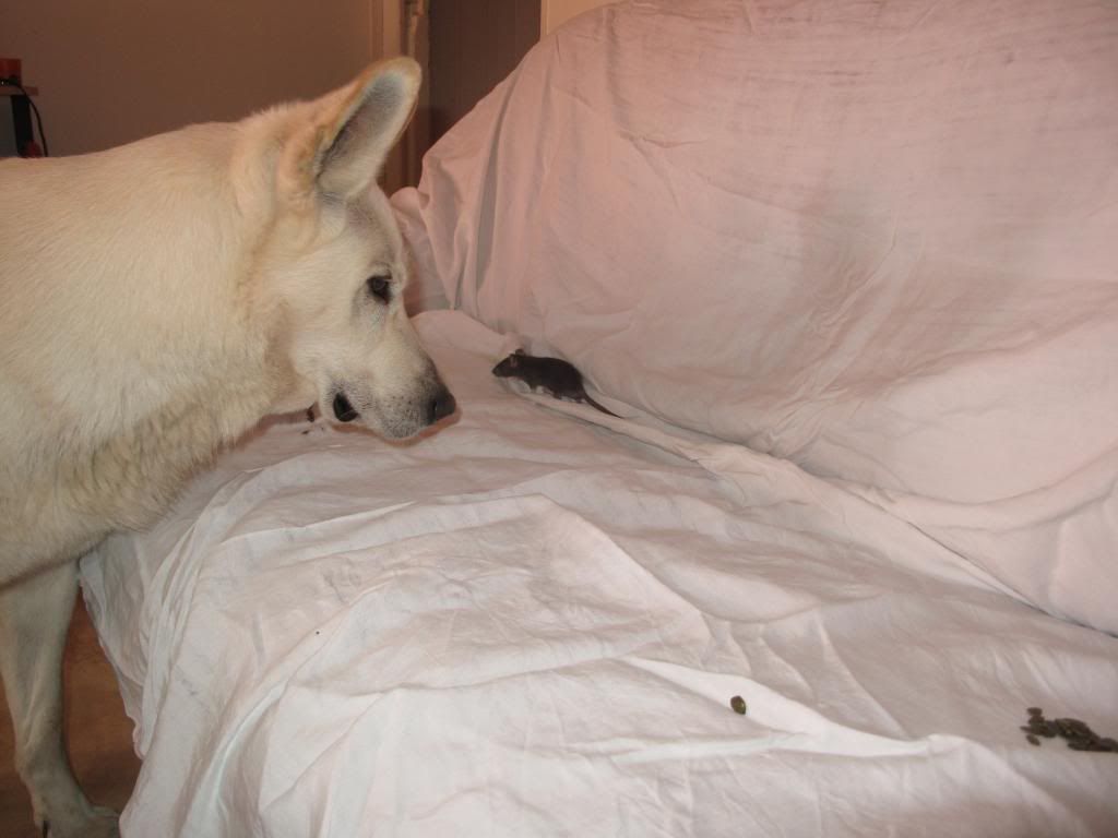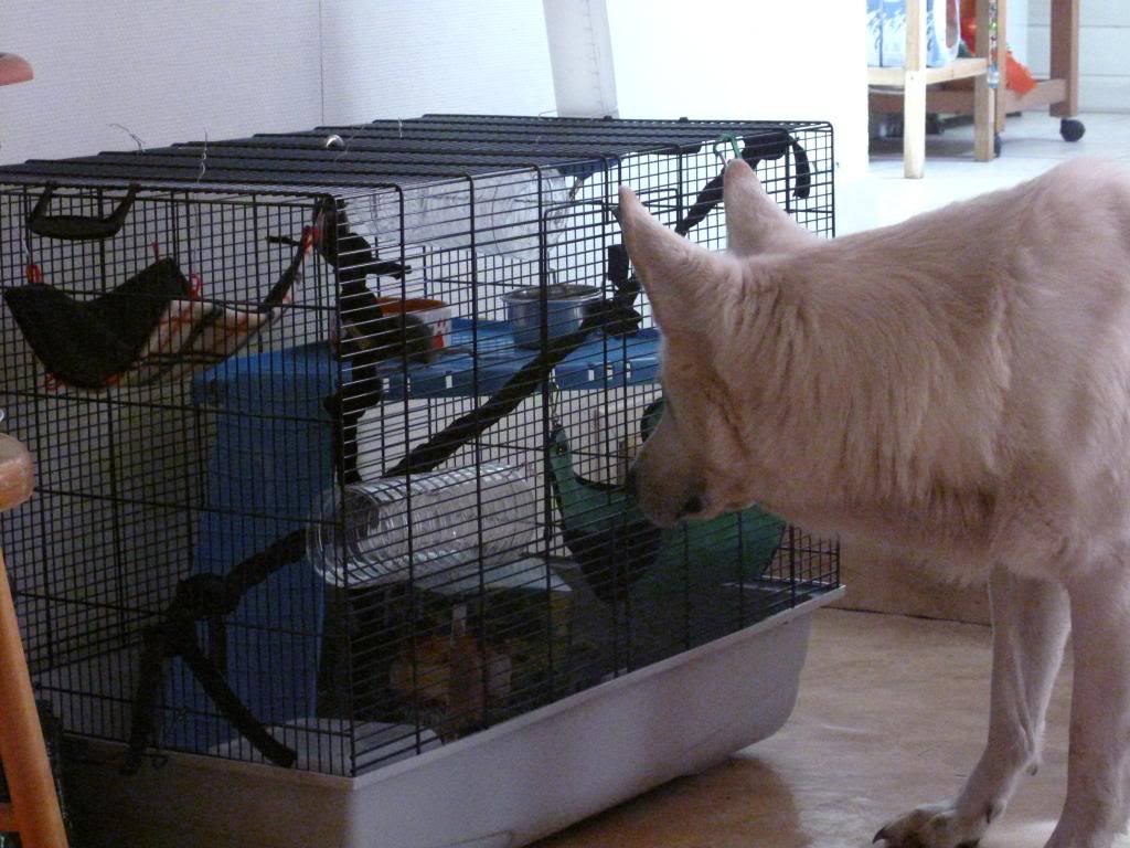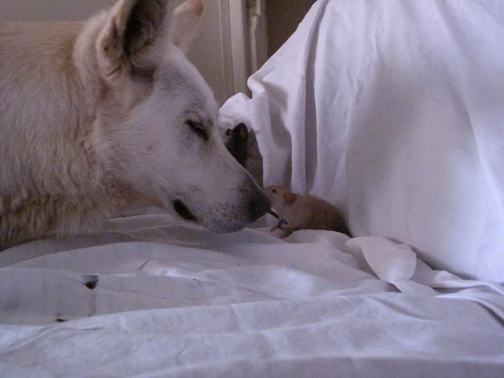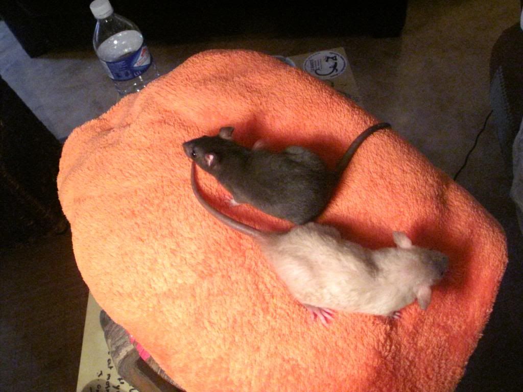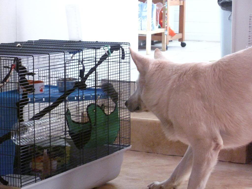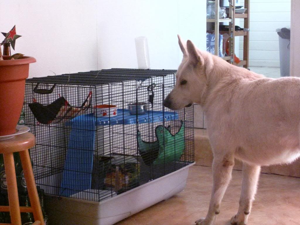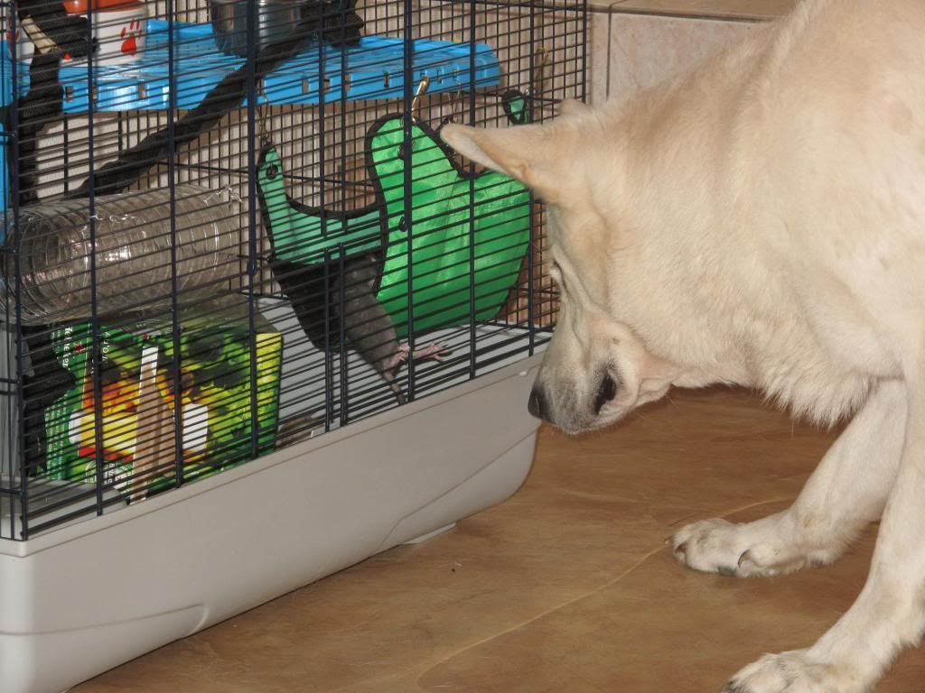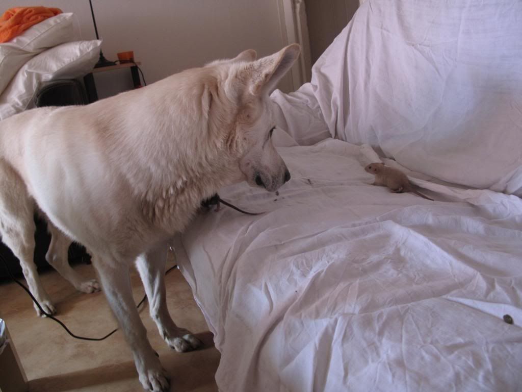 Orfée11 0 Posté(e) le 9 avril 2013 Certains le savent peut etre déjà mais avant d'entrer dans le monde des souris j'étais plutôt rats, j'ai eu beaucoup de ratous chez moi, mâles et femelles pendant plusieurs années. la perte de mon dernier rat m'avait tellement anéantie que je ne voulais plus en reprendre.....mais voilà après 5 ans sans rat, j'ai craqué à nouveau à l'occasion d'Houten. et je ne regrette pas !! j'avais oublié ce que c’était les rats, mais comment ai je pu m'en passer si longtemps ?? j'ai donc adopté deux petits mâlous, je n'ai pas encore de photos individuelles, ces messieurs sont un peu trop speed pour poser plus de 5 secondes, je poste donc les photos de leur première rencontre avec Famas. Au début chacun s'est reniflé a travers les barreaux, puis rencontre sur le canapé, les ratoux avaient un peu peur au départ mais il ont vite compris que Famas serait un copain pour eux et ils s'amusent a lui mettre des coups de pattes puis a s'enfuir sous le pull de maman, et ainsi de suite depuis 10mn....le chien leur mets de gros coup de langue pour se venger. c'est quoi cette nouvelle cage ? elle est où la bestiole ? elle est sur l'étage !! sacrée grosse souris c'est bizarre ...oh elle vient me dire bonjour....chacun semblant curieux de rencontrer l'autre...allez hop sur le canapé : et enfin la photo bonus, les petits m'ont sauté sur les genoux pendant que je prenais les photos, et Famas a suivi le mouvement, vu d'en haut ça donne ça : le petit raton noir berkshire se prénomme Morzan, il vient de chez Nadine, il a 5 semaines, il me semble très intelligent, il est vif mais déjà très proche de moi, il est constamment à vouloir me grimper dessus. L'autre est siamois rex, il se prénomme Murtagh, il a environ 6 semaines, lui c'est plus une petite patate qui s’endort dans ma capuche ou mon écharpe pendant des heures, il est adorable et ses oreilles dumbo lui donne une bouille de peluche. bientôt des photo individuelles, quand ils seront plus calmes !! Partager ce message Lien à poster Partager sur d’autres sites