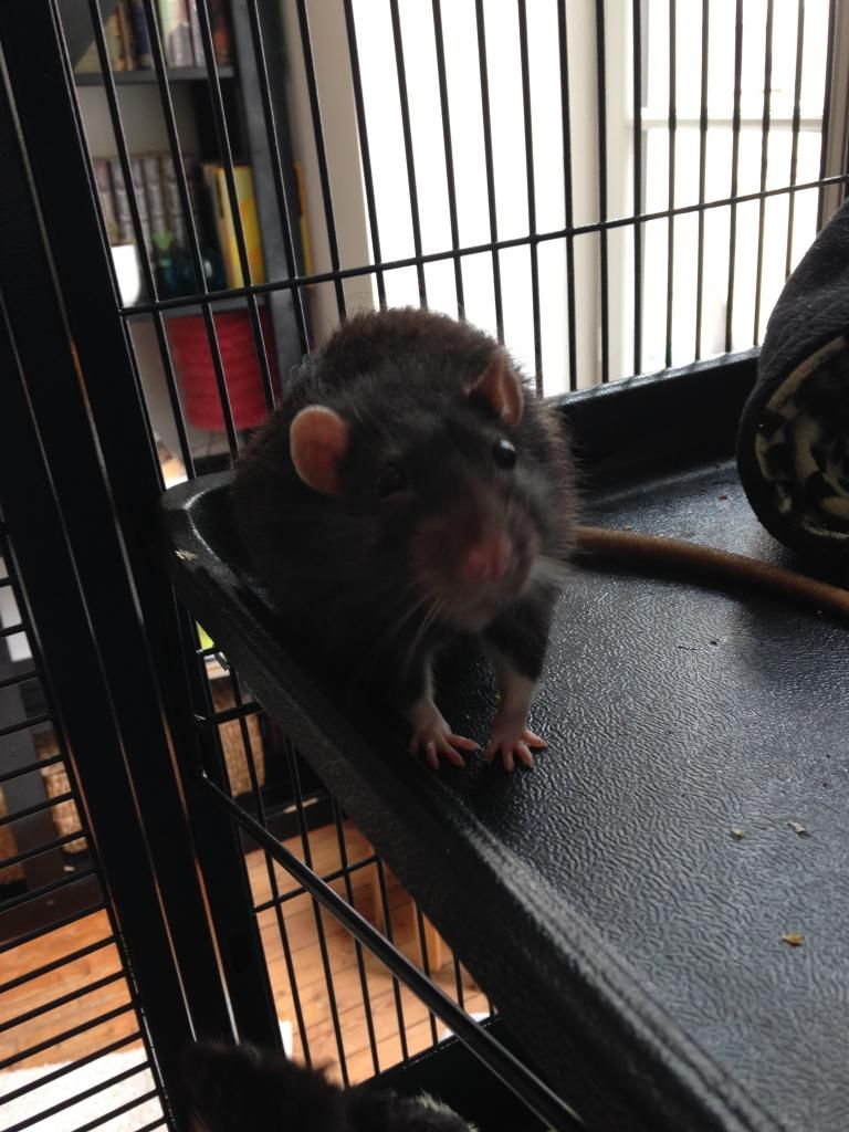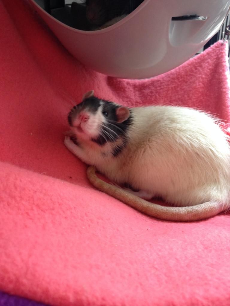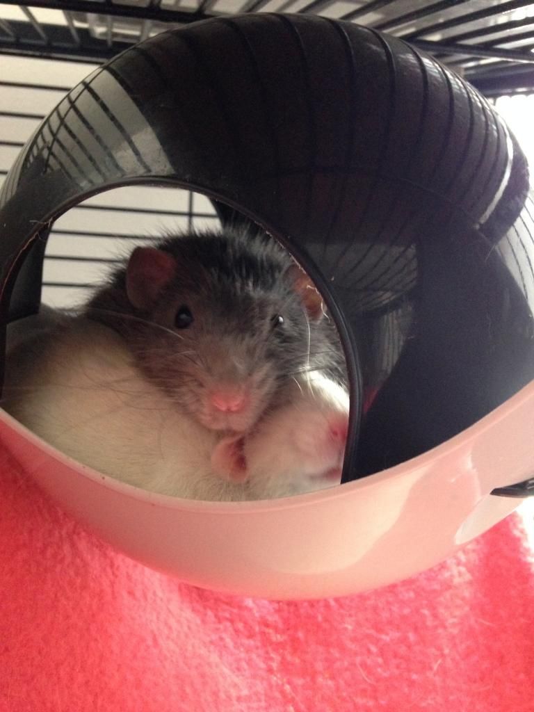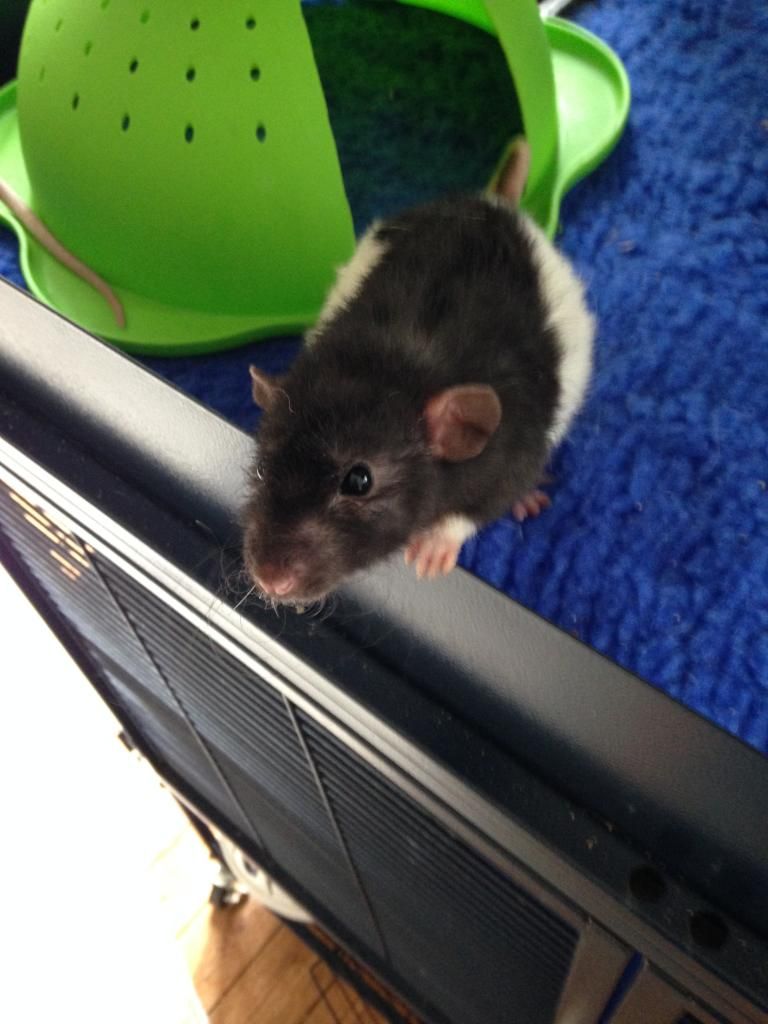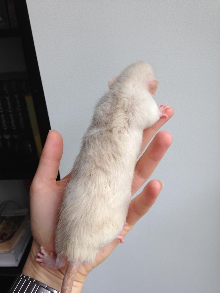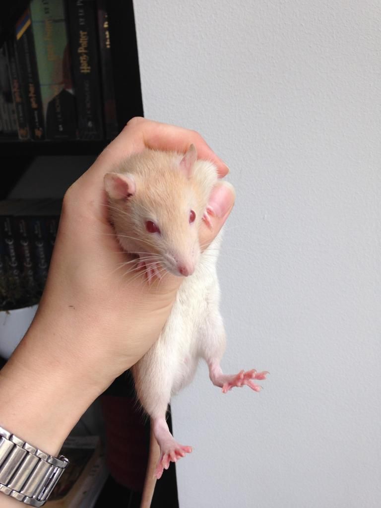 Orfée11 0 Posté(e) le 12 décembre 2014 ça fait bien longtemps que je n'ai pas donné de nouvelles de mes rats, pas de photos de tout le monde, mais bientôt je vais m'y atteler ! Morzan nous a quitté après un AVC hémorragique, on a tous fait pour tenter de le sauver avec mon véto, il s'est battu et accroché pendant 3 jours, il y a u du mieux, il mangeait a nouveau seul, marchait un peu, puis le soir du troisième jour en rentrant du boulot j'ai vu que c'était la fin, mon bébé est mort dans mes bras. C'était mon vieux, un peu mon chouchou je dois l'avouer, il me manque terriblement, et grâce à Banzaï j'ai de magnifiques photos de lui prises lors de l'ARS .... merci encore : Mathieu a été castré car il se montrait de plus en plus agressif envers ses copains de cage et aussi envers nous, depuis tout est rentré dans l'ordre, il est redevenu gentil et câlin, il a perdu sa place de dominant dans le groupe, Maxime est passé "chef" et se montre beaucoup moins tyrannique que son prédécesseur, ouf ! . Milo et Mazout ont toujours un comportement joueur, de vrais bébés, surtout Milo qui adore jouer à "la bataille" avec moi. Marvel, un amour de rat, nous sommes très fière qu'il ait été choisi pour figurer sur les badges de l'AFAR ! mais en même temps qui peut résister à une bouille pareille : Et enfin, oui j'ai honte, mais j'ai ENCORE craqué pour un bébé raton à Houten, chéri m'avait donné le feu vert (Morzan est parti... ils ne sont plus que cinq, si tu trouve un raton chouchou ramène le ! ). Donc voici Malcolm, raton de 5 semaines, bleu US dumbo lisse , un AMOUR, il s'est très vite attaché à moi, réclame a sortir dès que je passe devant sa cage de quarantaine, du coup il passe énormément de temps avec moi, dans ma capuche, il me fait des bisous, il joue..... j'adore ce bébé et ne regrette pas de l'avoir adopté Partager ce message Lien à poster Partager sur d’autres sites