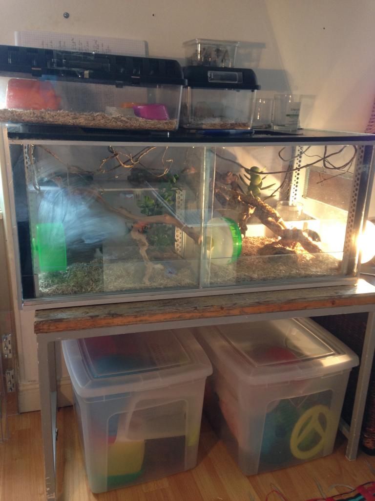 Orfée11 0 Posté(e) le 13 octobre 2014 hello à tous ! avec mon homme nous avions depuis quelques mois l'idée d'offrir plus d'espace de vie à nos micromys minutus, après longue réflexion , nous avons choisi de detourner une étagère . Le projet a enfin vu le jour, et nous sommes très satisfaits du résultat ! bien sur c'est encore un peu vide, nous comptons faire une grosse commande de nouveaux accessoires prochainement , maintenant que nous visualisons mieux l'espace disponible . le groupe des femelles dispose des trois étages du haut, et celui des mâles des deux étages du bas. Il y'a deux aérations par étage, une de chaque coté , pour assurer un flux d'air, nous n'en feront pas plus pour le moment, si nous constatons de l'humidité ou une odeur forte dans le terrarium nous avons prévu de faire des trous dans les vitres en plus . place aux photos : chez les femelles : chez les mâles : Partager ce message Lien à poster Partager sur d’autres sites