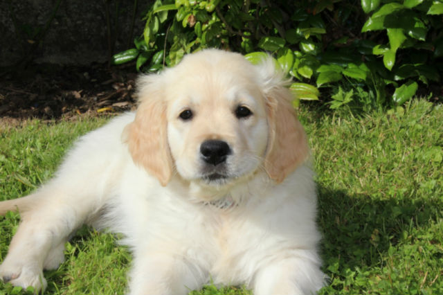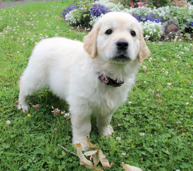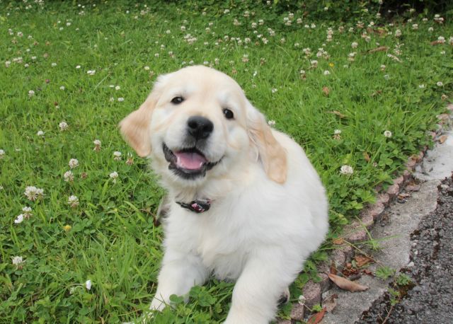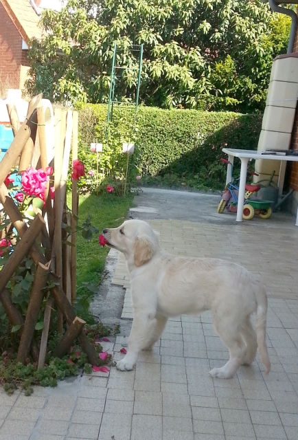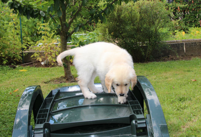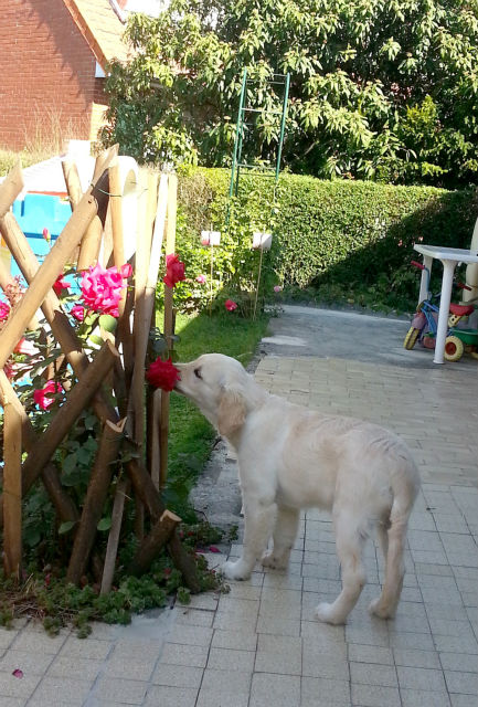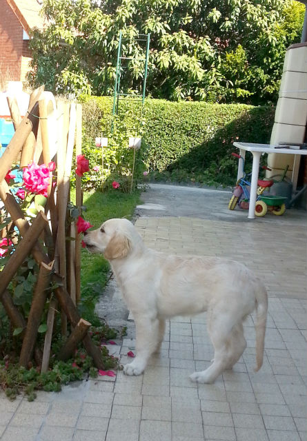 pastellou 0 Posté(e) le 9 juillet 2012 Bonsoir,Je vous présente Hélia du Clos des Facons (miss jaune), fille d'Awaï et d'Elliot, née le 14 mai. Elle est arrivée aujourd'hui dans sa nouvelle maison et semble s'y plaire . Elle a commencé à explorer la jardin et mâchonné quelques brins d'herbe ;)Elle est vraiment magnifique, câline, douce et attentive. Je suis sous le charme de cette petite princesse. Elle a tout du golden de rêve. Merci à Bruno Watterlot de l'élevage du Clos des Facons.Elle a déjà trouvé sa place pour être le plus proche possible de moi : Elle dort entre mon fauteuil et mon bureau . Elle a repris spontanément la place qu'occupait Pastelle.Une nouvelle aventure qui commence Partager ce message Lien à poster Partager sur d’autres sites
