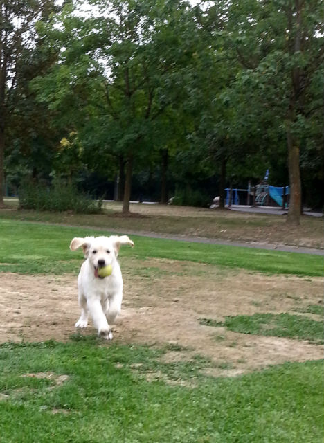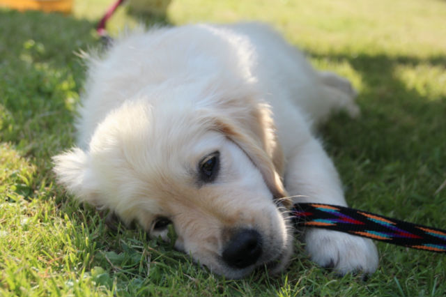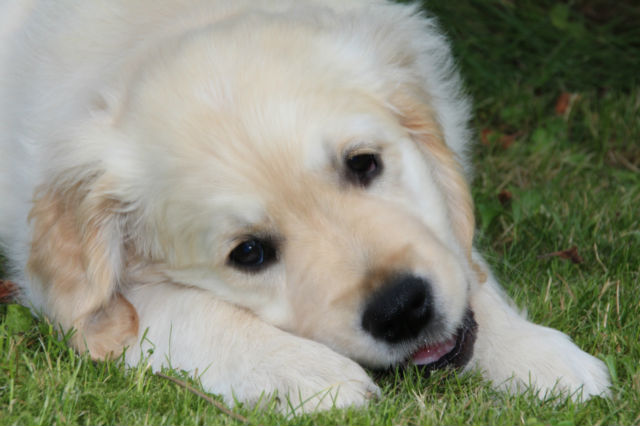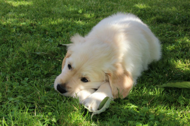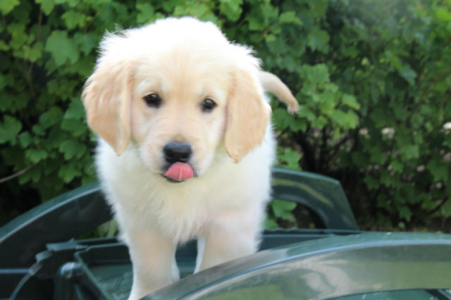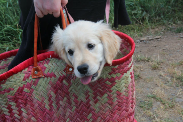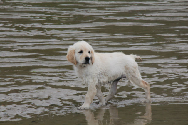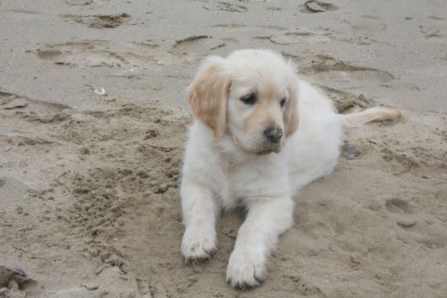 pastellou 0 Posté(e) le 14 août 2012 Mon Hélia a 3 mois aujourd'hui . Elle grandit à toute vitesse, découvre de nouvelles bêtises à faire tous les jours mais est propre de jour et de nuit depuis le début, marche plutôt bien au pied en laisse, intègre bien les ordres de base... Elle revient quand on l'appelle sauf si évidemment la branche ou la grenouille morte trouvée dans le jardin sont plus attirantes lol.En résumé, c'est une petite goldinette extra, qui use de son charme et de sa petite bouille craquante ;). Je l'aime ma petite chipie. Le plus difficile à gérer avec Hélia, ce sont les mordillements très appuyés et les sauts sur les enfants mais je ne désespère pas, on y arrivera.Quelques petites photos des vacances en Bretagne. Hélia adore le sable mais a peur des vagues . Elle a bien aimé les longues balades, surtout portée dans le cabas où elle pouvait dormir tranquille Partager ce message Lien à poster Partager sur d’autres sites