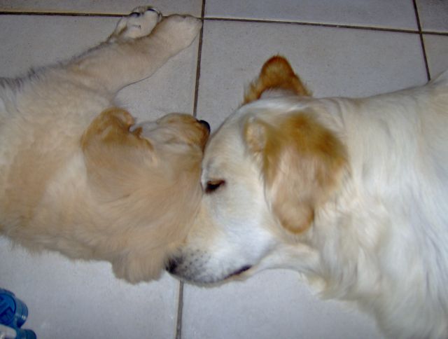 Oliviou♫ 0 Posté(e) le 1 juin 2013 Comme chaque année, nous avons le devoir de célébrer l'une des activités les plus importantes de nos chers poilus : la sieste !Le règlement du concours de juin sera donc assez simple : postez une photo dont vous êtes l'auteur, avec votre ou vos loulous (loulouttes) en position sieste, sommeil, repos, enfin, quand ça pionce ! Et même, dans certains cas, un intrus pourrait s'inviter, comme sur cette photo que j'aime bien :Et n'oubliez pas de mentionner le (les) nom de votre Canis Lupus Familieris ! Je ne connais pas tous les Goldens du Forum ! A vos canapés ! Partager ce message Lien à poster Partager sur d’autres sites