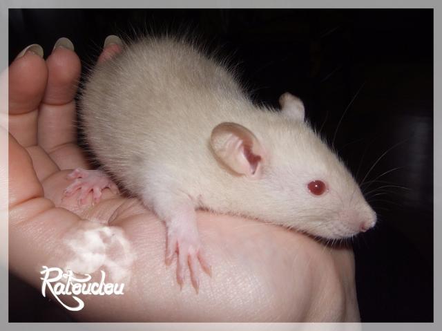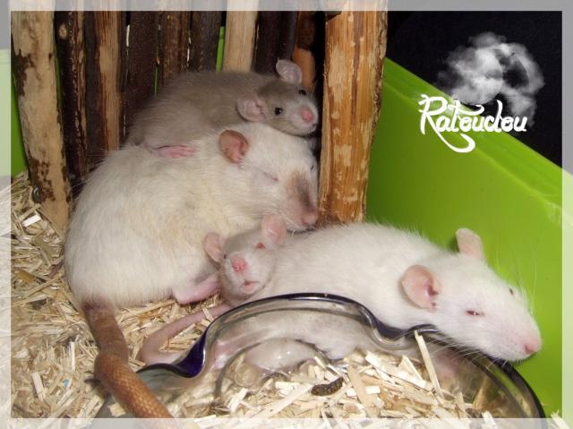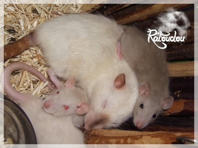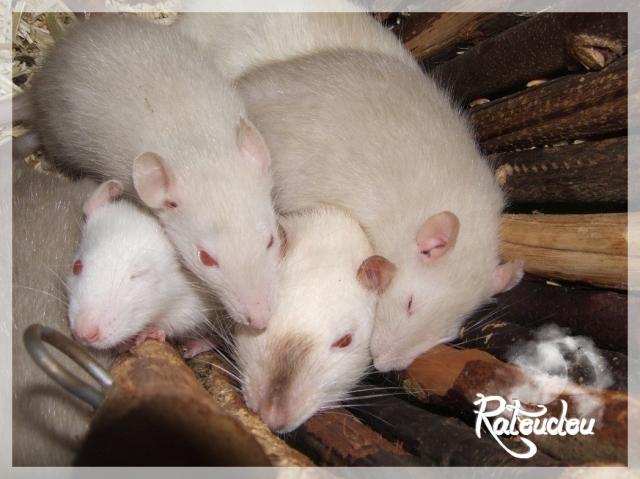 sev255 0 Posté(e) le 5 juillet 2011 Date de naissance de la portée 12/06/2011Nom du Père : Pilgrim* Description : irish burmese (base himalayen) standard lisse* Provenance : particulier, Angel* Généalogie : (très peu complète, ETR Bippo se trouvant dans la lignée)- Père : mâle venant d'animalerie (décédé à plus de 2 ans de vieillesse)- Mère : burmese bleu russe (décédée à 1 an 1/2 d'une épidémie)- - -> Père : ??- - -> Mère : burmese mink* Numéro d'inscription au LORD : IND21215M* Date de naissance : approximativement fin septembre 2009 (environ 2 mois à son arrivée le 25/11/09)* Poids à la saillie : faisait 777grs le 28/04 dernier* Autres informations : Pilgrim c'est un vrai patapouf qui se laisse vivre, un grooos nounours, calme, posé (même trop xD) d'un caractère super cool, vraiment adorable c'est une bonne pate, n'a jamais été malade mis à part un rhume à l'arrivée.Sa page sur mon site http://ratterieratoudou.e-monsite.com/rubrique,pilgrim,329956.html(je sais juste qu'un de ses frères a eu une tumeur vers 15 mois, et sa mère a fait 2 portées, dans l'autre l'une des femelles a été adopté et reproduite par Louloute68)Nom de la Mère : Bamboo* Description : siamoise seal point standard lisse* Provenance : animalerie (elle fait surement partie d'une portée qu'un particulier a déposé là-bas)* Généalogie: inconnue* Numéro d'inscription au LORD : INC23858F* Date de naissance : approximativement début novembre 2010 (environ 3 mois lors de son achat le 07/02/11)* Poids à la saillie : 350grs* Autres informations : Bamboo est une ratte très gentille, n'a pas eu trop de mal à s'acclimater à son arrivée bien qu'elle était gestante sans le savoir, ceci dit elle a été une maman assez protectrice en essayant de choper les doigts, RAS santé, elle c'est plutot bien intégrée aux autres, ni dominante ni dominée, vient facilement vers moiActuellement les bébés ont 3 semaines je peux les approcher comme je veux.Sa page sur mon site http://ratterieratoudou.e-monsite.com/rubrique,bamboo,366725.html(j'ai retrouvé via petite annonce une de ses "soeurs" siamoise du même âge adoptée dans la même animalerie, sa proprio a aussi eu droit à des bébés kinder c'est elle qui m'a dit qu'elles venaient à priori d'une portée d'un particulier)La portée :* Au total 12 petits sont nés mais l'un d'eux était mort-né, restait donc 11 bébés en vie, 7 femelles pour 4 mâles, tous standard lisse burmese siamois et himalayen* Informations complémentaires : cette portée ne faisait pas partie de mes "projets" ça c'est fait un peu à l'improviste, fin 2010 j'avais déjà voulu reproduire Pilgrim mais monsieur n'avait pas daigné bouger son popotin... puis j'ai apprit la tumeur de son frère et j'ai abandonné l'idée de la reproduction.Seulement, mon gros arrive sur ses 20 mois et vraiment RAS niveau santé et comportement, je souhaitais faire reproduire Bamboo par la suite (partir d'une nouvelle base, intégrer un sang nouveau avec elle), et puis ça c'est fait comme ça... j'ai tenté de les mettre ensemble pour une nuit et faut croire que ça a marché...!Petite présentation des ratons qui sont encore à l'adoption :- Femelle irish burmese standard lisse- Femelle irish siamoise standard lisse- Femelle himalayenne standard lisse- Femelle himalayenne standard lisse- Femelle himalayenne standard lisse- Mâle irish siamois standard lisse- Mâle himalayen standard lisseBonus* date d'adoption possible : adoptables à partir du 25/07/2011 à leurs 6 semaines* Participation financière demandée : 12€ par raton comme à chaque portée* départements d'adoption possibles : le DOUBS 25 , un covoiturage sera mit en place pour PARIS 75 , possibilité d'en emmener dans le NORD Pas-de-Calais 62 (début août), d'autres covoiturages sont acceptés si vous les trouvez, ou alors vous vous déplacez.* vos conditions d'adoptions : - remplir le questionnaire http://ratterieratoudou.e-monsite.com/rubrique,questionnaire-adoptants,16971.html- avoir déjà des rats du même sexe que le raton souhaité, sinon les adopter au minimum par 2- avoir une cage suffisament grande- offrir à vos rats une litière et alimentation adaptées- accordez du temps et des sorties régulières à vos rats- leur donner les soins nécessaires et soins vétérinaires en cas de problèmes- me donner régulièrement des nouvelles, j'en demande pas tout les mois mais de temps en temps, le plus important et j'insiste là dessus étant de me tenir informée en cas de problèmes de santé ou tout autres soucis.- les ratons encore disponibles sont tous interdits à la reproduction et je ne reviendrais pas sur ma décision (le seul étant autorisé pour le moment est le petit mâle que je garde), ceci pour avoir un meilleur suivi et controle de la descendance et pouvoir agir plus facilement si jamais il y a de gros problèmes.* Vos coordonnées : me contacter par MP Partager ce message Lien à poster Partager sur d’autres sites
