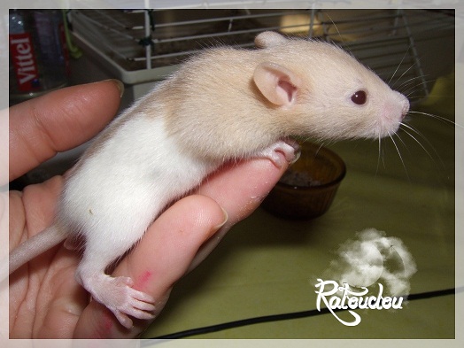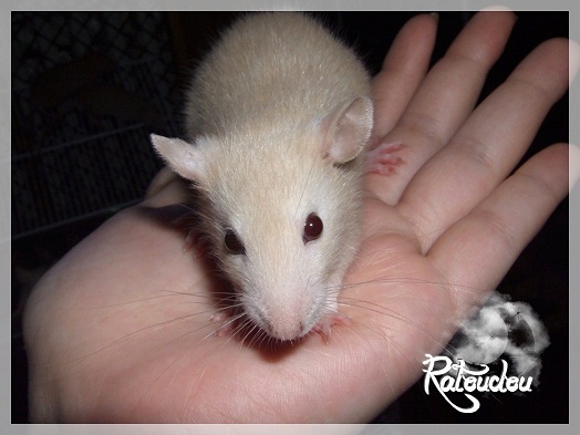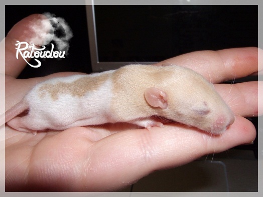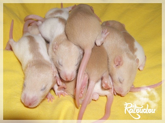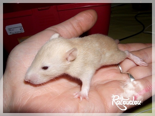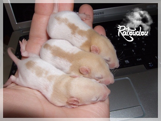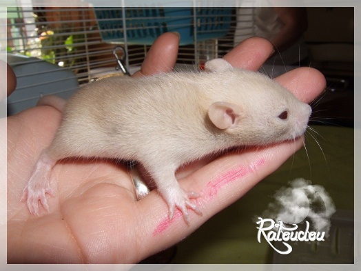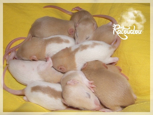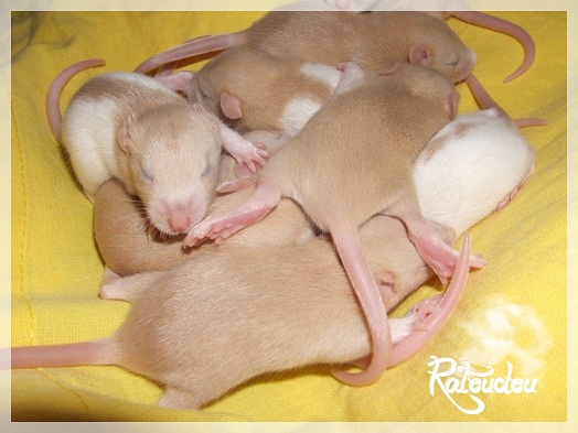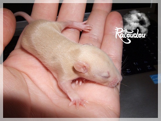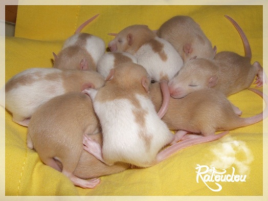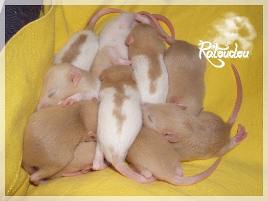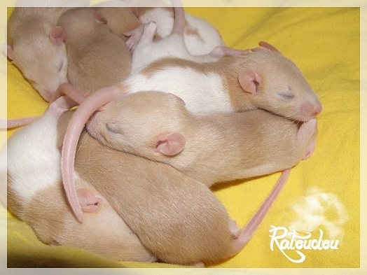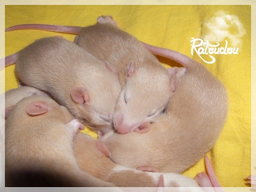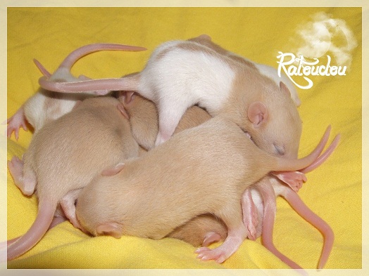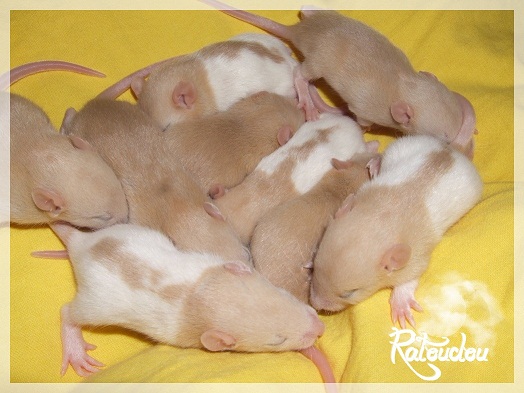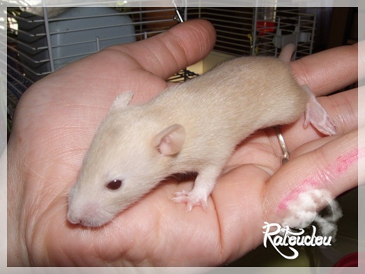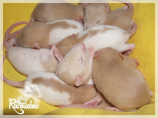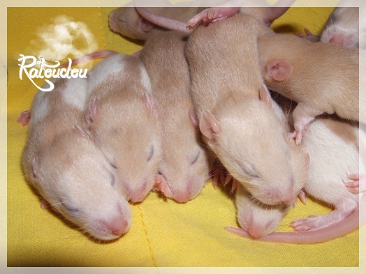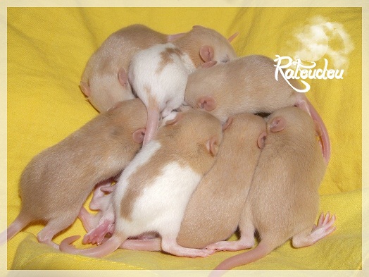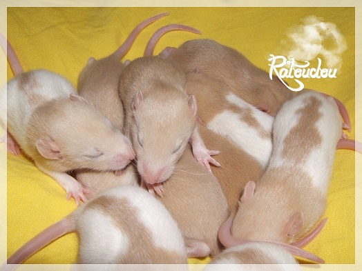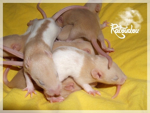 sev255 0 Posté(e) le 12 septembre 2011 Date de naissance de la portée : 02 septembre 2011 dans l après-midi@ Nom du Père : MDT Pimousse* Description : hooded topaze standard lisse* Provenance : Mordu-de-rats en Belgique* Généalogie : - Père : Brutus , uni topaze standard lisse (particulier, février 08 - 14/05/10 vieillesse)- Mère : MDT Shyva , hooded platine agouti standard lisse (née le 21/05/09 - 04/01/11 inconnu, calme amitieuse réservée)- - -> Père : Kira, irish bleu us standard lisse (animalerie Tom&Co Nalinnes, né fin décembre 08 - 16/08/11 vieillesse, calin calme curieux amitieux paternel, un poils dominant)- - -> Mère : Lili, hooded topaze standard lisse (particulier, née fin décembre 08, calme simpa - décédée récemment de vieillesse en 2011 mais perdu la date à cause du LORD qui a supprimé sa fiche...)- - - - - -> Père : agouti lisse standard- - - - - -> Mère : hooded topaze standard lisse* Numéro d'inscription au LORD : MDT17165M* Date de naissance : 10/12/09* Poids à la saillie : 650grs environ* Autres informations : cest un rat parfaitement intégré qui ne pose pas de problème dans le groupe (même avec de nouveau arrivants), il est cool et gentil, étant plus jeune il était assez impulsif (je pense que cest pour ça que les essais avec Kayna en mars ont échoué, il cherchait à la dominer plus quautre chose..)Il a toujours été en parfaite santé, même pas un rhume contrairement à certains de mes mâles!!> http://ratterieratoudou.e-monsite.com/rubrique,mdt-pimousse,334377.html@ Nom de la Mère : Kayna* Description : unie topaze standard lisse* Provenance : élevage La Ferme du Odentale dans le 57 (tenant aussi une animalerie) * Généalogie : - Père : topaze standard lisse (élevage "la ferme du odentale" 57)- Mère : topaze standard lisse (élevage "la ferme du odentale" 57)* Numéro d'inscription au LORD : INC20749F* Date de naissance : 16/06/10* Poids à la saillie : 315grs* Autres informations : une ratte très sociable, avec du caractère tout de même, joueuse, marrante, aimant assez le contactJamais été malade non plus. Cest sa 2nd portée.> http://ratterieratoudou.e-monsite.com/rubrique,kayna,355554.html@ La portée :* Nombre de petits : 11 bébés sont nés (dont 1 mort-né), seulement 3 femelles pour 7 mâles* Informations complémentaires : Je souhaite redémarrer une "lignée" de RED en espérant avoir le moins de problèmes possible (notamment tumeurs), recule possible seulement sur la fratrie/famille de Pimousse (précisions à venir, 1 soeur décédée à 1 an 8 mois cause inconnue, 1 soeur décédée à presque 5 mois raison non précisée sur le LORD, 1 frère décédé à 4 mois 1/2 accidentellement chez le veto suite à castration)* date d'adoption possible : à partir du 15 octobre au 6 semaines des ratons* Participation financière demandée : 12€ demandé par raton pour participer au frais délevage (envoie demandé à la 3ème semaine des ratons pour valider la réservation)* départements d'adoption possibles : Doubs 25 à coté de la Suisse (possibilité de s'arranger pour des covoiturages notamment dans les grandes villes comme Lyon, Paris, Strasbourg...)d'autres covoiturages acceptés si sérieux (à vous de vous organiser), ou alors vous vous déplacez..* vos conditions d'adoptions :- avant tout, lire tout ce qui concerne l'adoption http://ratterieratoudou.e-monsite.com/categorie,conditions-et-tarifs,1203615.html- remplir le questionnaire http://ratterieratoudou.e-monsite.com/rubrique,questionnaire-adoptants,16971.html- avoir déjà des rats du même sexe que le raton souhaité, sinon les adopter au minimum par 2- avoir une cage suffisament grande- offrir à vos rats une litière et alimentation adaptées- accordez du temps et des sorties régulières à vos rats- leur donner les soins nécessaires et soins vétérinaires en cas de problèmes- me donner régulièrement des nouvelles, j'en demande pas tout les mois mais de temps en temps, le plus important et j'insiste là dessus étant de me tenir informée en cas de problèmes de santé ou tout autres soucis.- les ratons de cette portée ne seront pas tous autorisés de reproduction, les droits de repro seront très limités, à moi en priorité, ensuite à voir au cas par cas, je tiens à suivre convenablement la descendance.* Vos coordonnées : sev993@hotmail.fr ou par mp@ Photoooooooos :Les 3 femelles : 2 hooded et 1 unie/irish topaze? standard lisseLes 3 mâles hooded topaze? standard lisseLes 4 mâles uni/irish topaze? standard lisse (celui de gauche me parait plus clair, peut-être un platine agouti???...) Partager ce message Lien à poster Partager sur d’autres sites