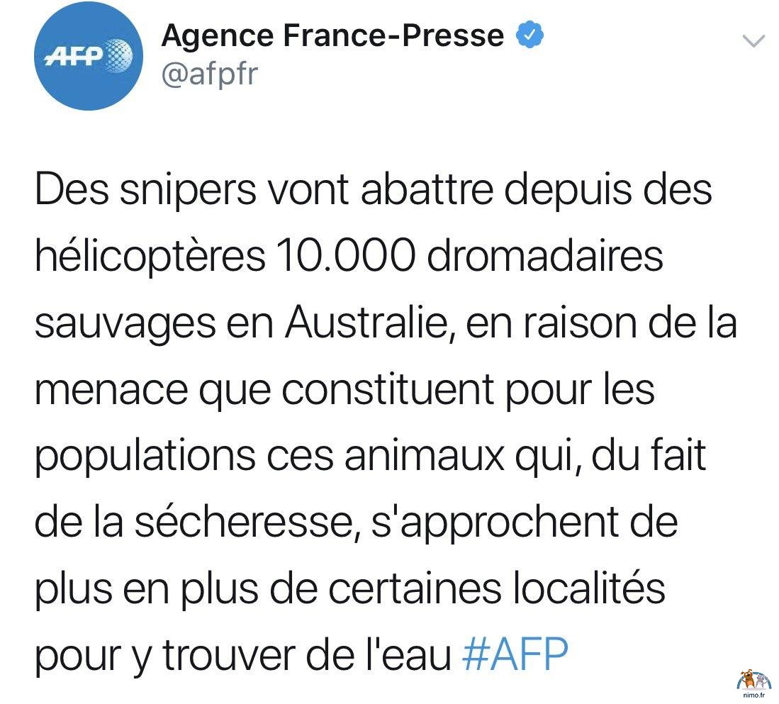 Des snipers australiens vont abattre 10.000 dromadaires sauvages car ils représentent une menace pour les habitants de certaines villes. Je n'ai même plus les mots ...
